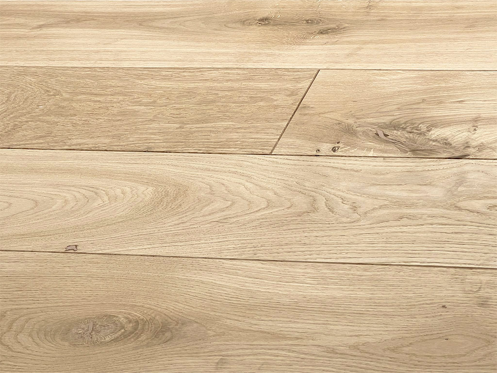 Die Massivholzdielen sind rustikal gemasert: Es finden sich viele schwarze Astlöcher und wenige Risse im Holz. Die strukturierte Oberfläche orientiert sich an der Maserung des Holzes und verleiht der Diele zusätzlich eine haptische Komponente. Um die Pflegleichtigkeit zu optimieren, kann die unbehandelte Oberfläche lackiert, geölt oder gewachst werden.