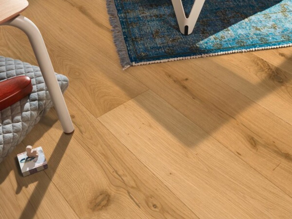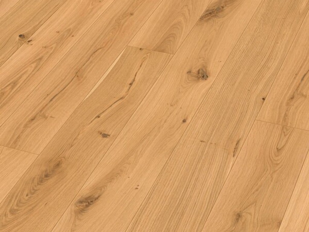 Die Dielen haben eine Breite von 18 cm, eine Länge von 220 cm und sind 13 mm stark. Die Klickverbindung "Masterclic Plus" garantiert eine schnelle und leicht zu handhabende schwimmende Verlegung. Die pflegeleichte 2,5 mm Nutzschicht besteht aus hochwertigem Edelholz und macht den Boden besonders robust. Über einer Warmwasserfußbodenheizung kann dieser Boden problemlos verlegt werden.