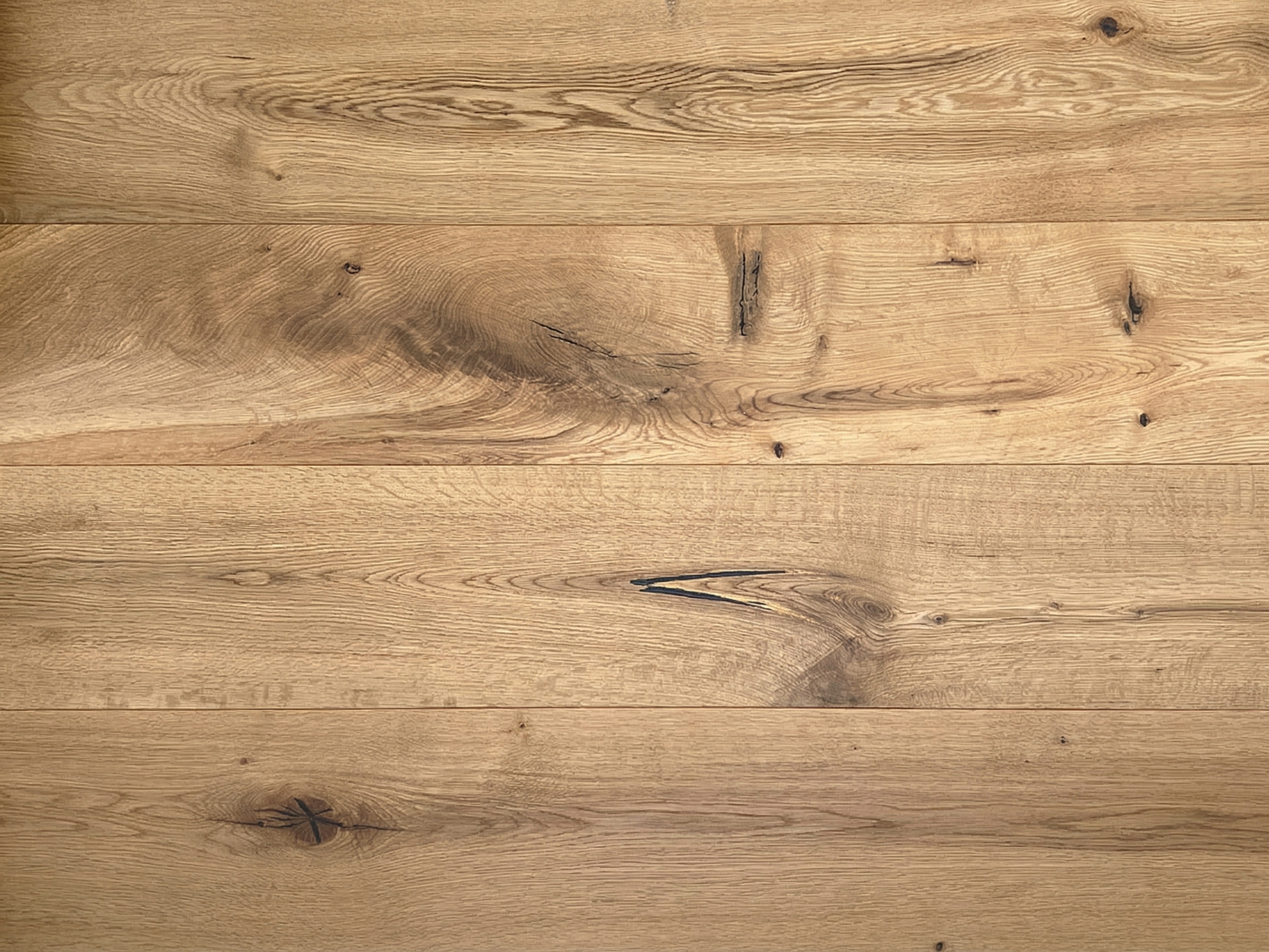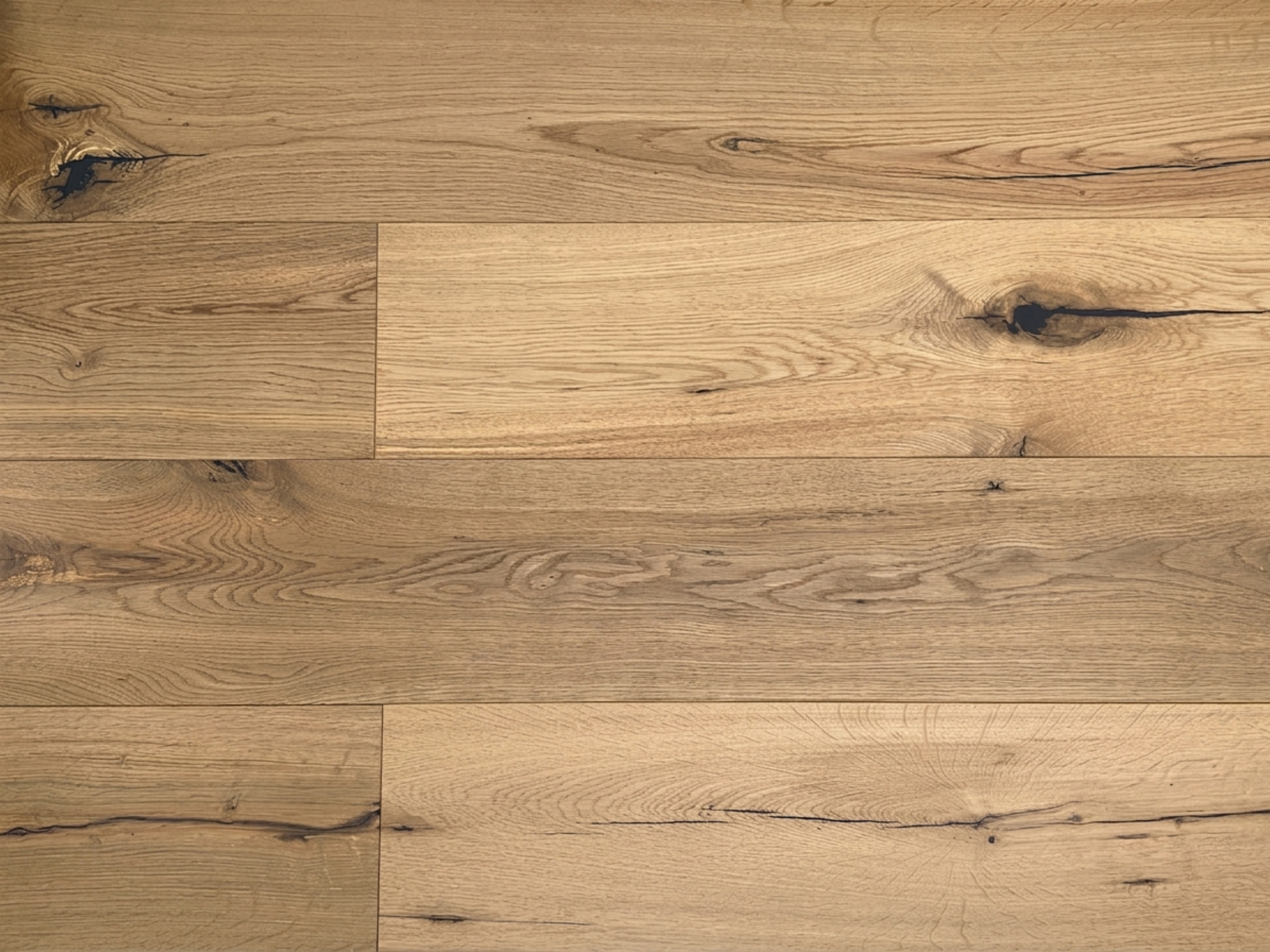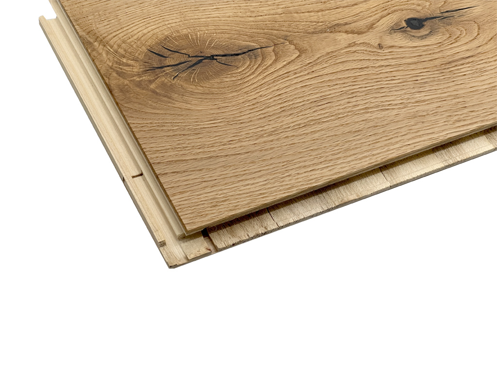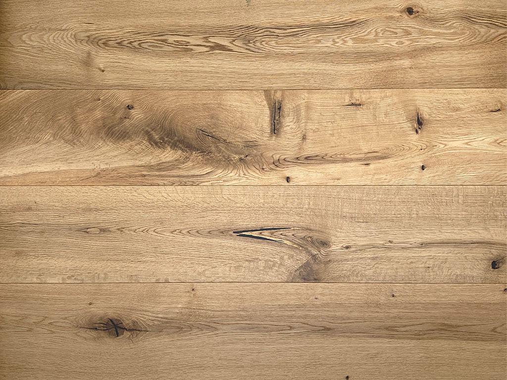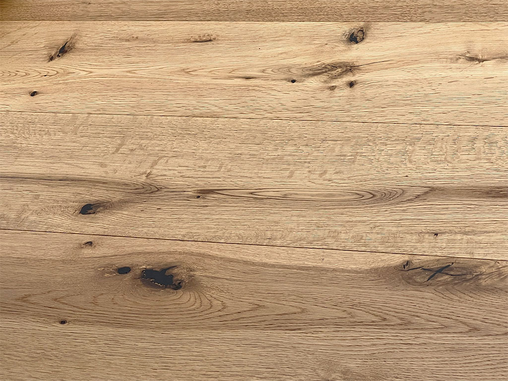 Das Parkett ist rustikal gemasert: Es finden sich viele schwarze Astlöcher und wenige Risse im Holz. Von weicheren Holzschichten befreit, bildet das harte, stabile Kernholz der Diele eine fühlbar strukturierte, dreidimensionale und lebendig wirkende Oberfläche. Die natürliche Ölung der Oberfläche belässt die Optik des Holzes unverfälscht, schützt es besser vor Feuchtigkeit und lässt es atmen.