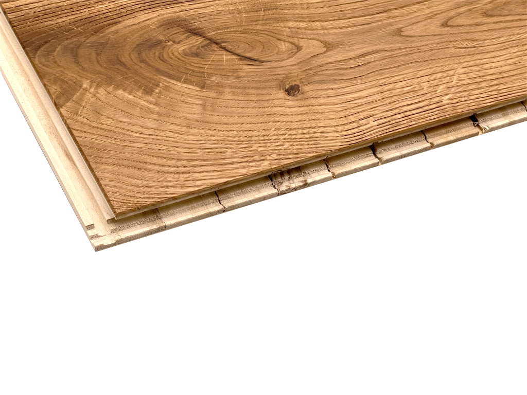 - 3-Schicht Parkett: Nutschicht, massive Holzmittellage, Gegenzug