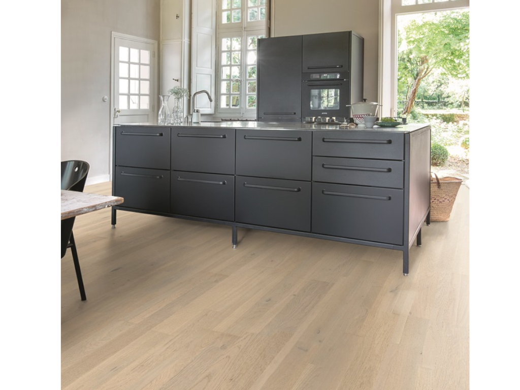 Die gebürstete Holzstruktur setzt die Maserung in ein besonderes Licht und sorgt so für eine schöne Tiefe. Die Oberfläche der Dielen ist ultramatt lackiert. Das macht den Boden pflegeleicht und sorgt für besondere Langlebigkeit. Der extrem widerstandsfähige Lack ist gegen Lebensmittelflecken beständig und sogar für stark beanspruchte Räume sehr gut geeignet.
