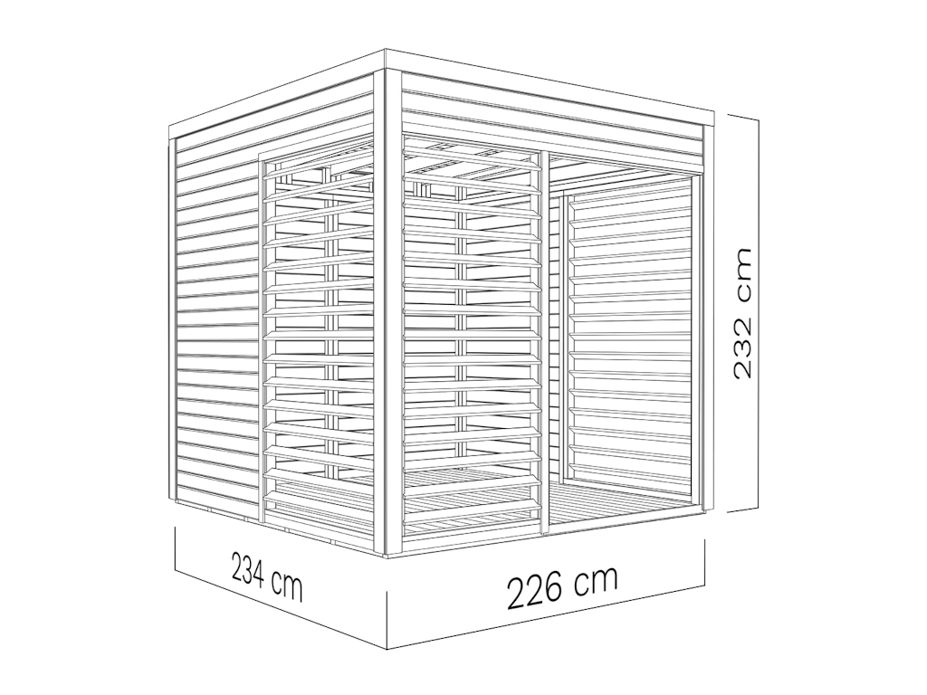 Der Pavillon hat eine Breite von 226 cm, eine Höhe von 232 cm und eine Tiefe von 240 cm. Orientiere dich für die Erstellung des Fundaments am Grundriss bzw. an der mitgelieferten Montageanleitung.