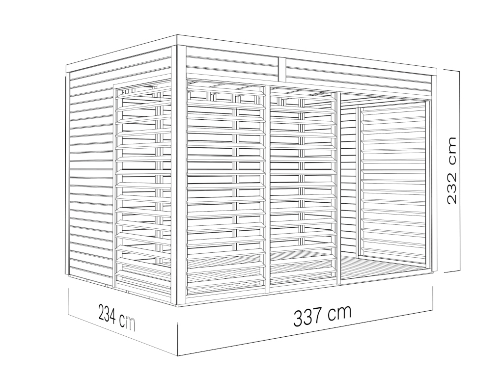 Der Pavillon hat eine Breite von 336 cm, eine Höhe von 232 cm und eine Tiefe von 240 cm. Orientiere dich für die Erstellung des Fundaments am Grundriss bzw. an der mitgelieferten Montageanleitung.