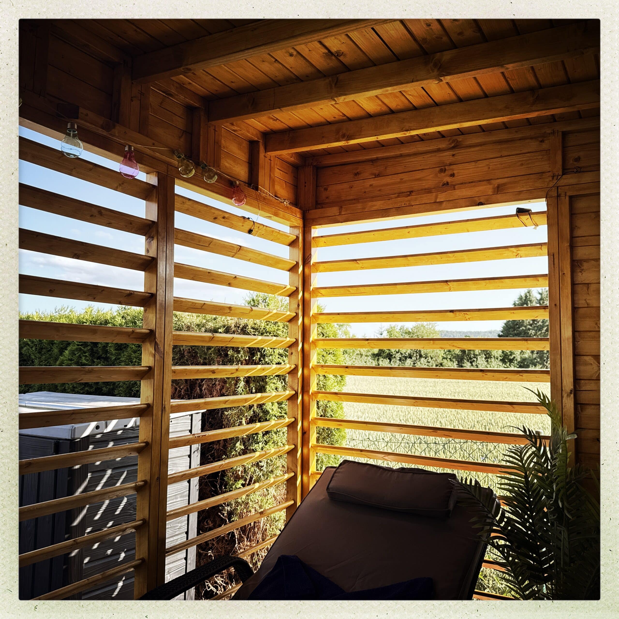 Das naturbelassene Holz sorgt für ein natürliches und zeitloses Aussehen. Bitte beachte, dass der Pavillon spätestens direkt nach der Montage mit einem Holzschutzmittel zu bearbeiten ist. Bei der Auswahl von Holzschutzmitteln empfehlen wir, dich im Fachhandel beraten zu lassen oder der Empfehlung des Herstellers zu folgen, die du in der beiliegenden Montageanleitung findest. Nach dem Erstanstrich sollte die Behandlung mindestens alle zwei Jahre wiederholt werden, um das Holz dauerhaft vor Verformung, Verwitterung und Schädlingsbefall zu schützen.