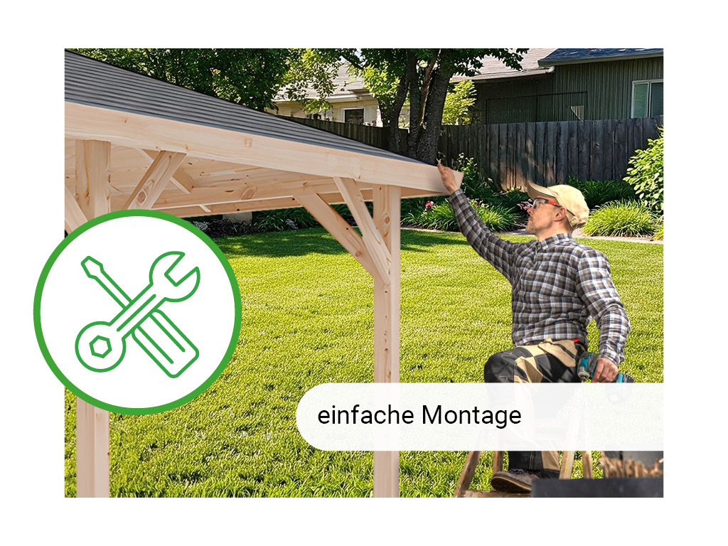 Das naturbelassene Holz sorgt für ein natürliches und zeitloses Aussehen. Bitte beachte, dass der Pavillon spätestens direkt nach der Montage mit einem Holzschutzmittel zu bearbeiten ist. Bei der Auswahl von Holzschutzmitteln empfehlen wir, dich im Fachhandel beraten zu lassen oder der Empfehlung des Herstellers zu folgen, die du in der beiliegenden Montageanleitung findest. Nach dem Erstanstrich sollte die Behandlung mindestens alle zwei Jahre wiederholt werden, um das Holz dauerhaft vor Verformung, Verwitterung und Schädlingsbefall zu schützen. Eine sich mit der Zeit entwickelnde, silbergraue Patina ist eine natürliche Eigenschaft des Holzes und stellt keinen Mangel dar.