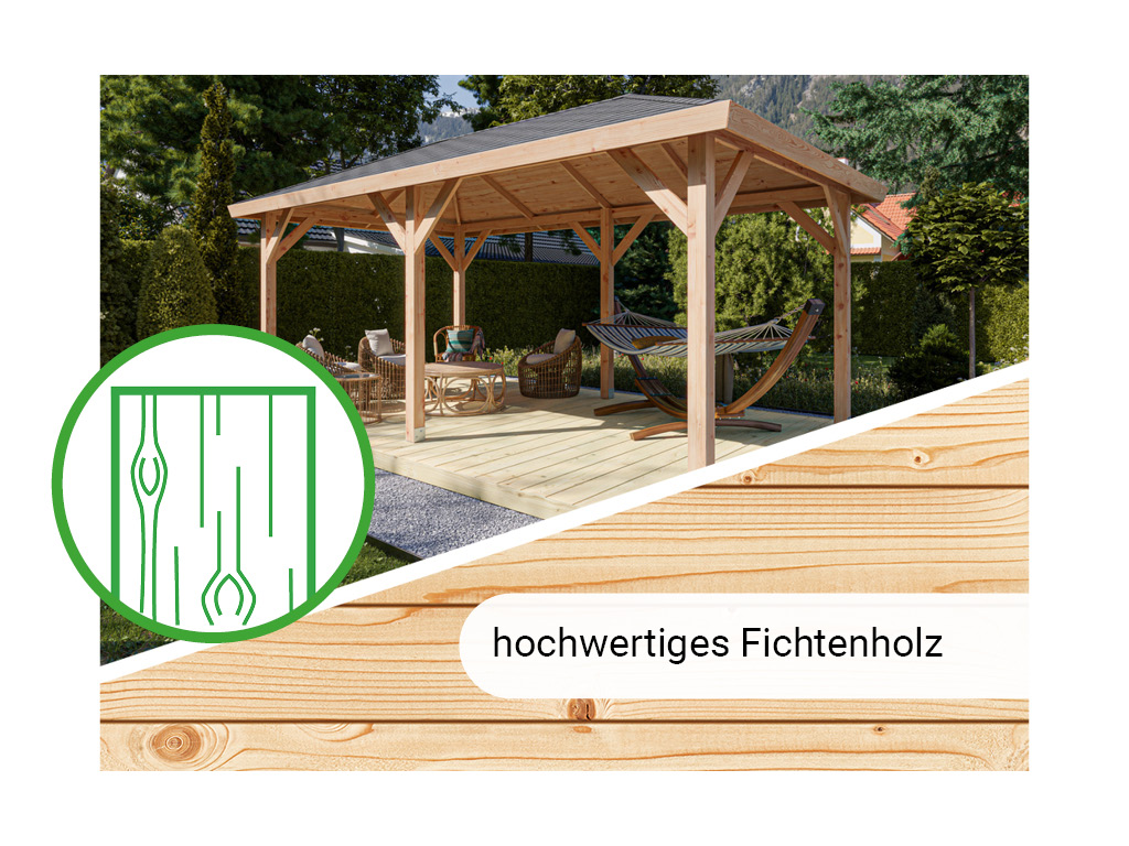 Der hochwertig gearbeitete Pavillon zeichnet sich durch sein ausgesuchtes erstklassiges Douglasienholz aus. Die Douglasie gehört zur Gattung der Nadelbäume und ist in der Dauerhaftigkeitsklasse 3 anzusiedeln. Ihr bräunlich-rotes bis gelbliches Holz verfügt über eine starke Maserung mit ausgeprägten Jahresringen, was ein strukturiertes und lebhaftes Holzbild zur Folge hat. Der Einsatz im Schiffsbau unterstreicht die enorme Widerstandskraft von Douglasienholz gegenüber Umwelteinflüssen, was sie u. a. dem geringen Quell- und Schwindverhalten verdankt.