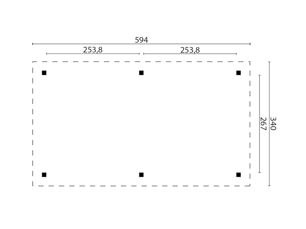 Der Pavillon hat eine Breite von 594 cm, eine Höhe von 310 cm und eine Tiefe von 340 cm. Orientiere dich für die Erstellung des Fundaments am Grundriss bzw. an der mitgelieferten Montageanleitung.
