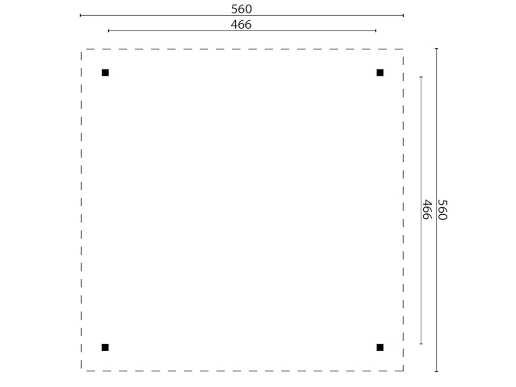 Der Pavillon hat eine Breite von 560 cm, eine Höhe von 375 cm und eine Tiefe von 560 cm. Orientiere dich für die Erstellung des Fundaments am Grundriss bzw. an der mitgelieferten Montageanleitung.