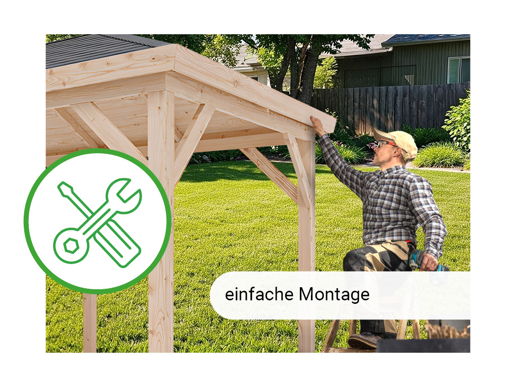 Das naturbelassene Holz sorgt für ein natürliches und zeitloses Aussehen. Bitte beachte, dass der Pavillon spätestens direkt nach der Montage mit einem Holzschutzmittel zu bearbeiten ist. Bei der Auswahl von Holzschutzmitteln empfehlen wir, dich im Fachhandel beraten zu lassen oder der Empfehlung des Herstellers zu folgen, die du in der beiliegenden Montageanleitung findest. Nach dem Erstanstrich sollte die Behandlung mindestens alle zwei Jahre wiederholt werden, um das Holz dauerhaft vor Verformung, Verwitterung und Schädlingsbefall zu schützen. Eine sich mit der Zeit entwickelnde, silbergraue Patina ist eine natürliche Eigenschaft des Holzes und stellt keinen Mangel dar.