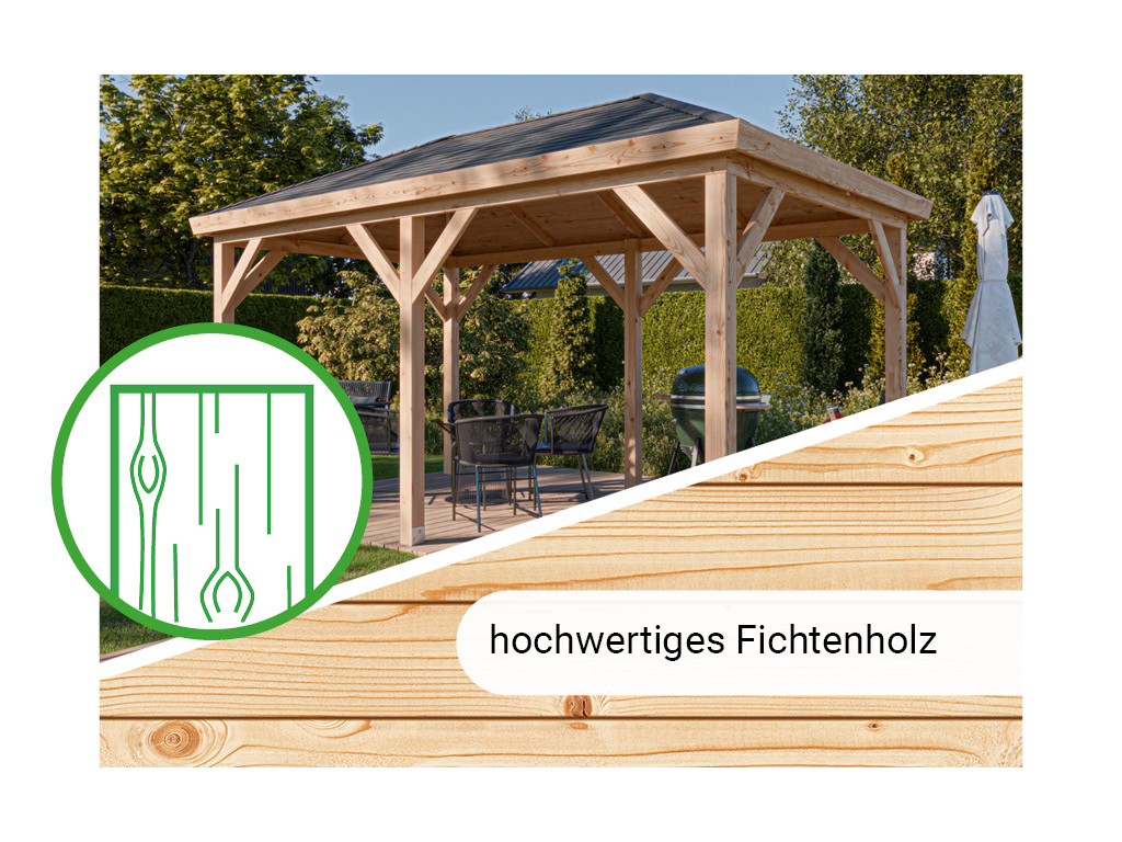 Der hochwertig gearbeitete Pavillon zeichnet sich durch sein ausgesuchtes erstklassiges Douglasienholz aus. Die Douglasie gehört zur Gattung der Nadelbäume und ist in der Dauerhaftigkeitsklasse 3 anzusiedeln. Ihr bräunlich-rotes bis gelbliches Holz verfügt über eine starke Maserung mit ausgeprägten Jahresringen, was ein strukturiertes und lebhaftes Holzbild zur Folge hat. Der Einsatz im Schiffsbau unterstreicht die enorme Widerstandskraft von Douglasienholz gegenüber Umwelteinflüssen, was sie u. a. dem geringen Quell- und Schwindverhalten verdankt.