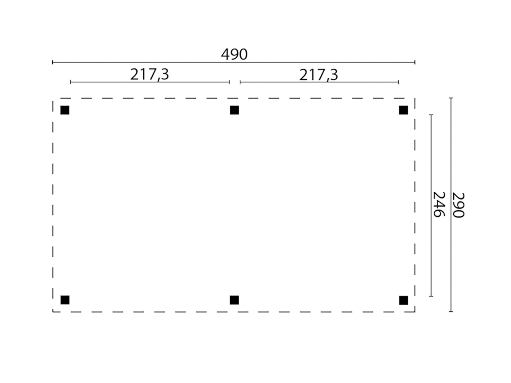 Der Pavillon hat eine Breite von 490 cm, eine Höhe von 290 cm und eine Tiefe von 290 cm. Orientiere dich für die Erstellung des Fundaments am Grundriss bzw. an der mitgelieferten Montageanleitung.