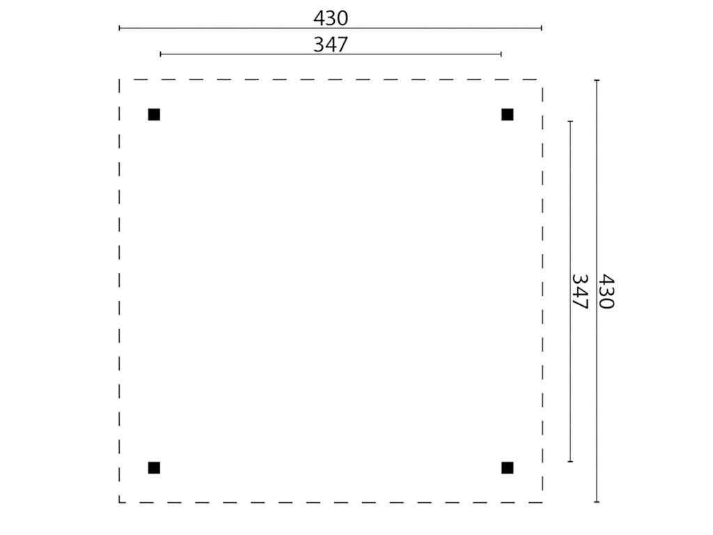 Der Pavillon hat eine Breite von 430 cm, eine Höhe von 330 cm und eine Tiefe von 430 cm. Orientiere dich für die Erstellung des Fundaments am Grundriss bzw. an der mitgelieferten Montageanleitung.