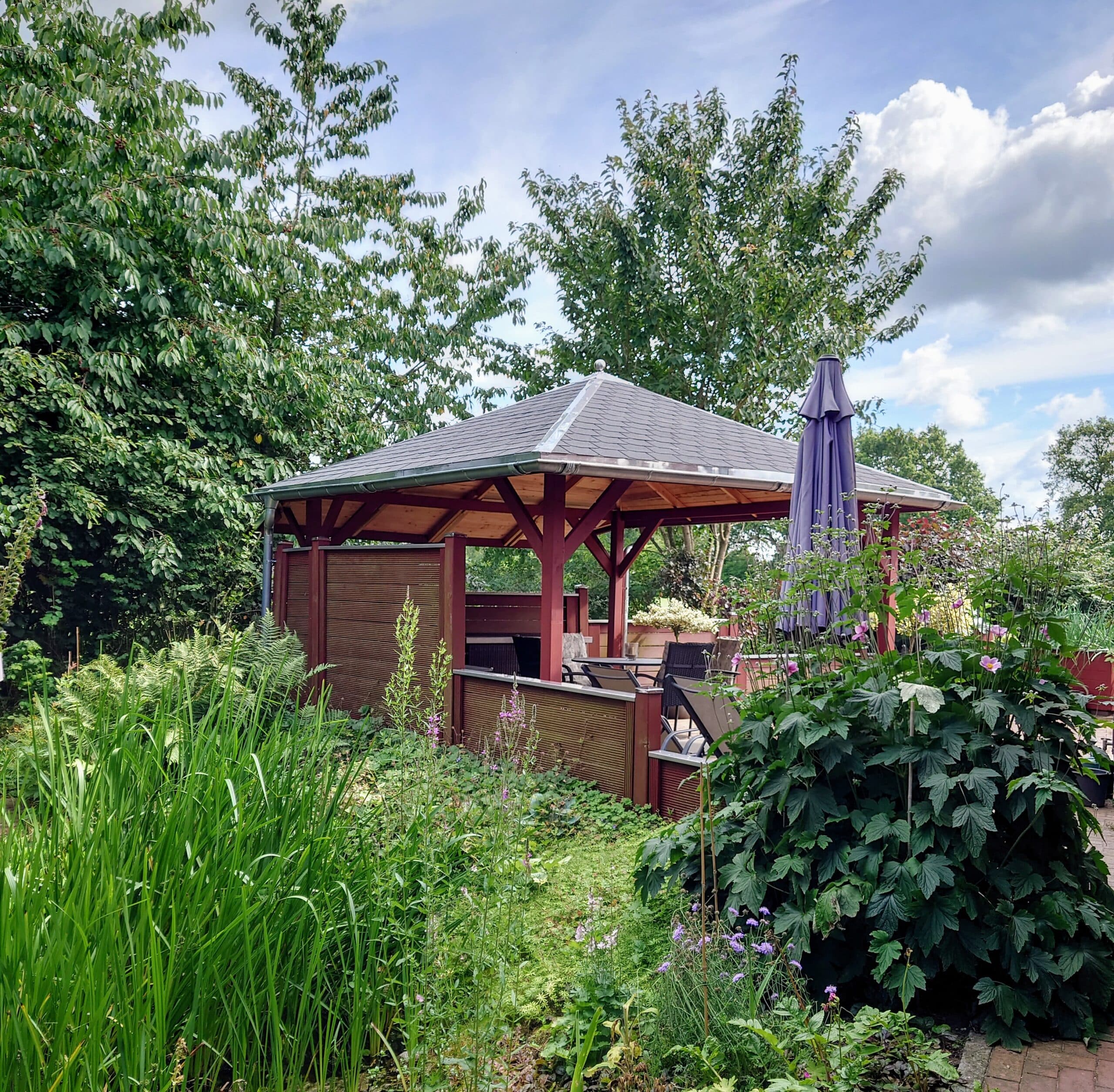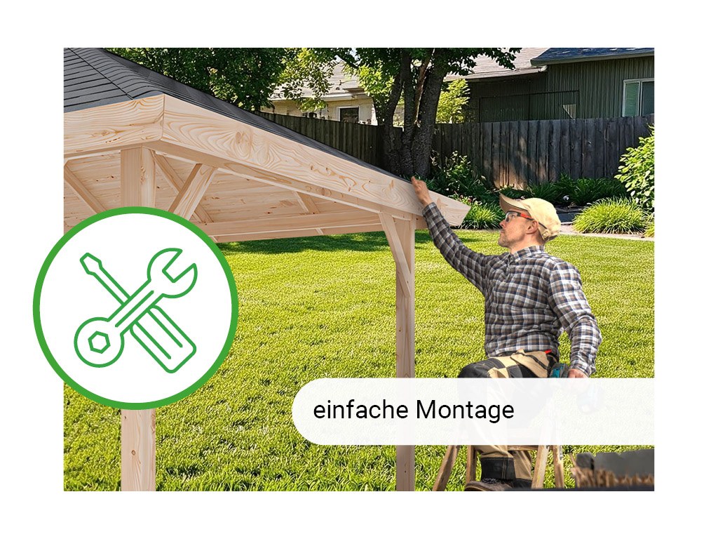 Das naturbelassene Holz sorgt für ein natürliches und zeitloses Aussehen. Bitte beachte, dass der Pavillon spätestens direkt nach der Montage mit einem Holzschutzmittel zu bearbeiten ist. Bei der Auswahl von Holzschutzmitteln empfehlen wir, dich im Fachhandel beraten zu lassen oder der Empfehlung des Herstellers zu folgen, die du in der beiliegenden Montageanleitung findest. Nach dem Erstanstrich sollte die Behandlung mindestens alle zwei Jahre wiederholt werden, um das Holz dauerhaft vor Verformung, Verwitterung und Schädlingsbefall zu schützen. Eine sich mit der Zeit entwickelnde, silbergraue Patina ist eine natürliche Eigenschaft des Holzes und stellt keinen Mangel dar.