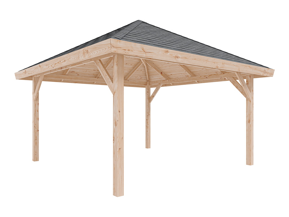 B x T x H: 430 x 430 x 330 cm, Sockelmaß B x T: 347 x 347 cm, Pfostenstärke 11,5 x 11,5 cm