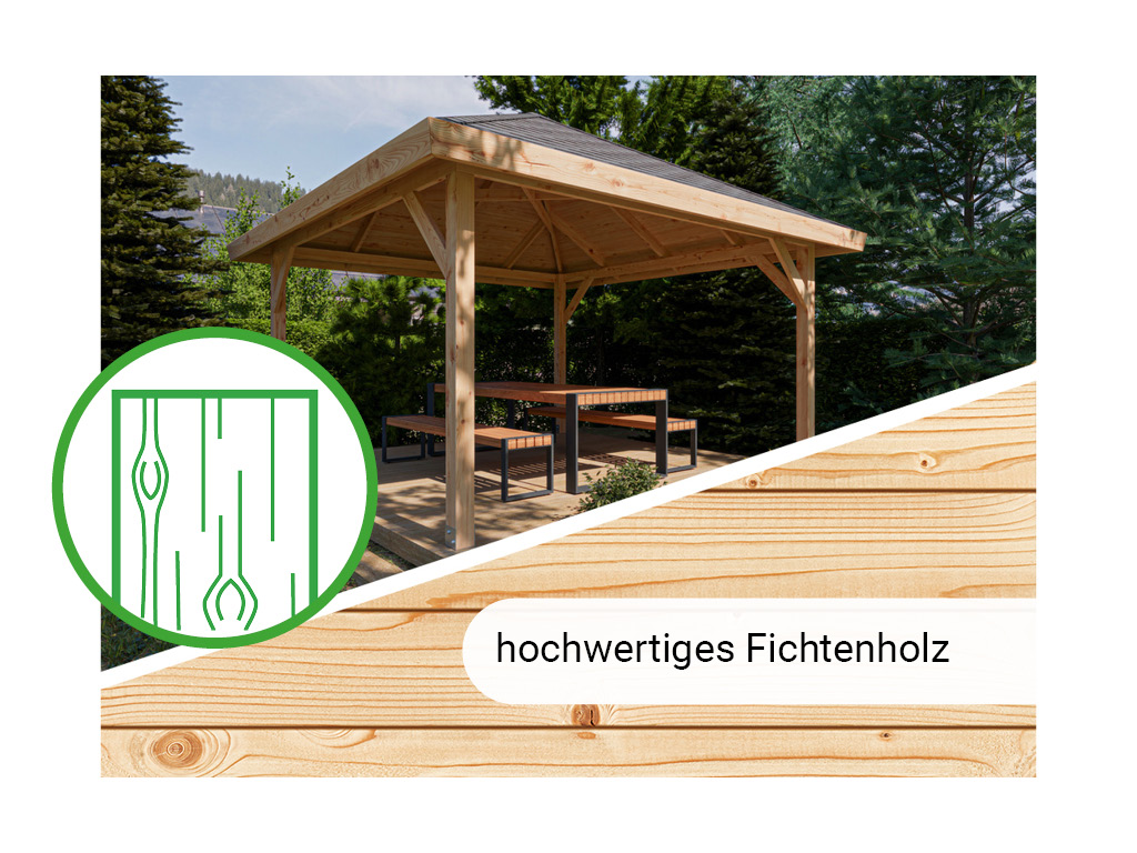 Der hochwertig gearbeitete Pavillon zeichnet sich durch sein ausgesuchtes erstklassiges Douglasienholz aus. Die Douglasie gehört zur Gattung der Nadelbäume und ist in der Dauerhaftigkeitsklasse 3 anzusiedeln. Ihr bräunlich-rotes bis gelbliches Holz verfügt über eine starke Maserung mit ausgeprägten Jahresringen, was ein strukturiertes und lebhaftes Holzbild zur Folge hat. Der Einsatz im Schiffsbau unterstreicht die enorme Widerstandskraft von Douglasienholz gegenüber Umwelteinflüssen, was sie u. a. dem geringen Quell- und Schwindverhalten verdankt.