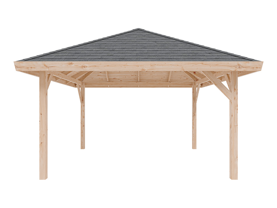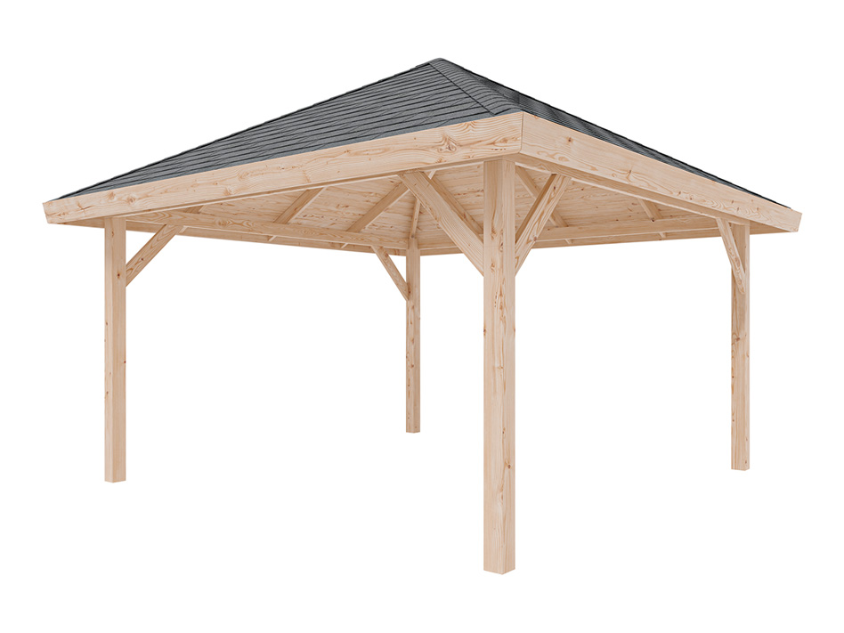 B x T x H: 430 x 430 x 330 cm, Sockelmaß B x T: 347 x 347 cm, Pfostenstärke 11,5 x 11,5 cm