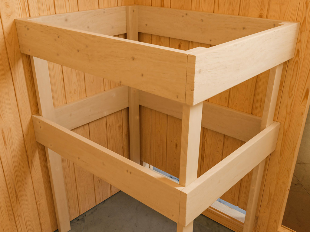 Die zwei stabilen Bankliegen aus Fichtenholz erhöhen den Komfort in dieser Innensauna. Zusätzlich ist ein Ofenschutzgitter und eine Kopfstütze aus massivem Fichtenholz im Lieferumfang enthalten. - Zubehör Empfehlung