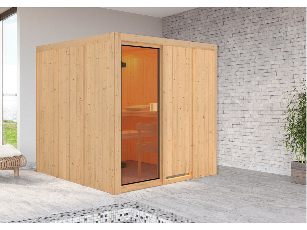 B x T x H: 196 x 196 x 198 cm, 3 Liegen, inkl. 9 kW Saunaofen mit integrierte Steuerung
