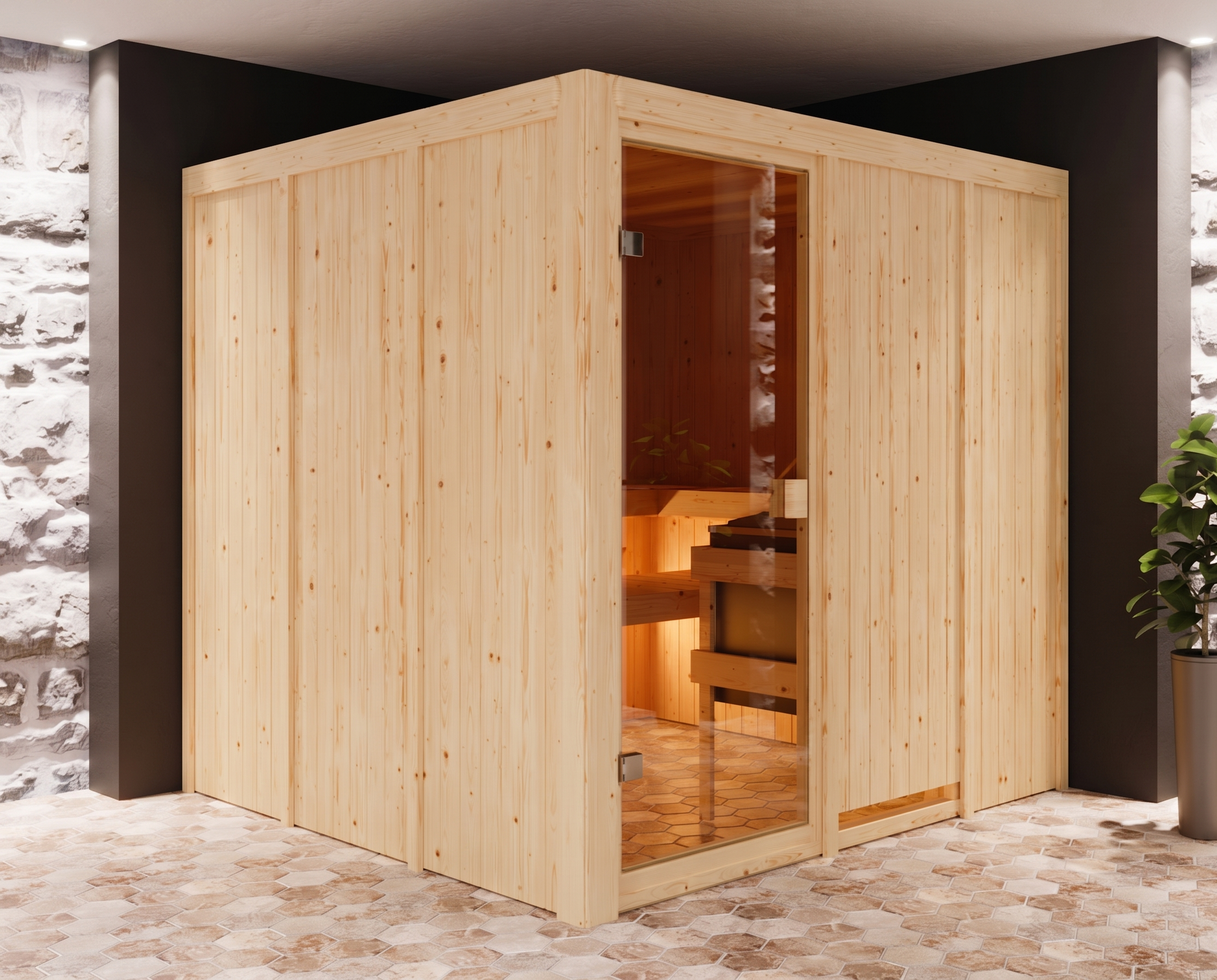 B x T x H: 196 x 196 x 198 cm, 3 Liegen, inkl. 9 kW Saunaofen mit integrierte Steuerung