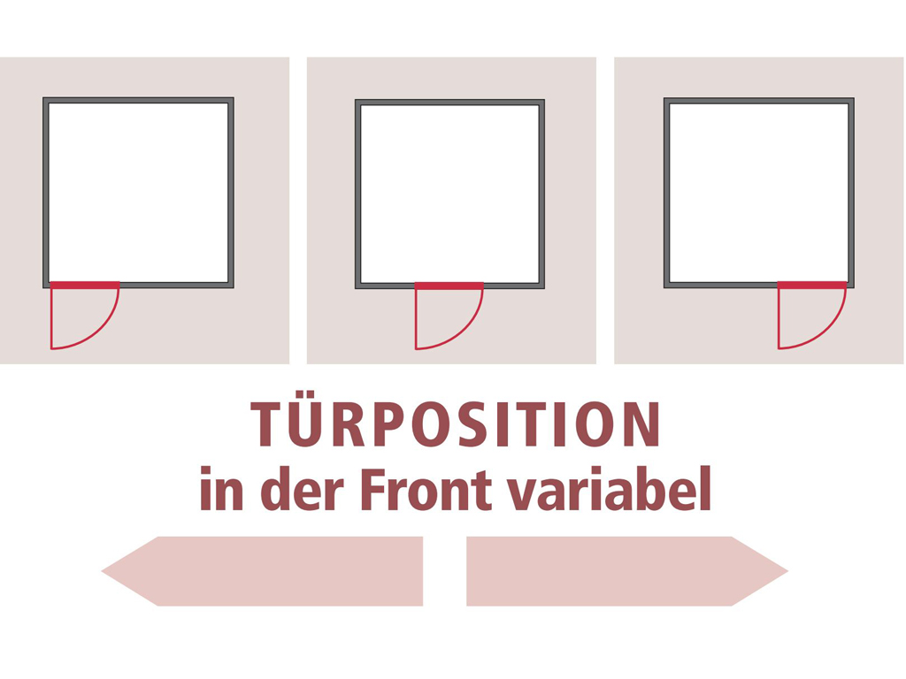 Die Saunatür kann in ihrer Position an der Frontseite der Sauna individuell angepasst werden. Sie lässt sich je nach Wunsch an der rechten Seite, der linken Seite oder direkt in der Mitte platzieren.