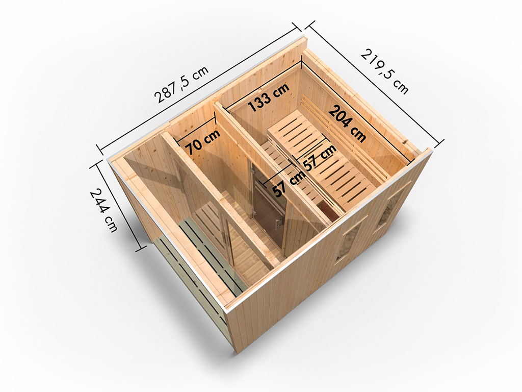 Die Maße dieser Sauna von B 288 x T 220 x H 244 cm erlauben es, dass 1-2 Personen gleichzeitig saunieren können. Mit 2 Liegen wird das Erlebnis für jeden Saunagast besonders angenehm. In der Grundausstattung sind 2 Liegebänke (Breite ca. 57 cm) enthalten.