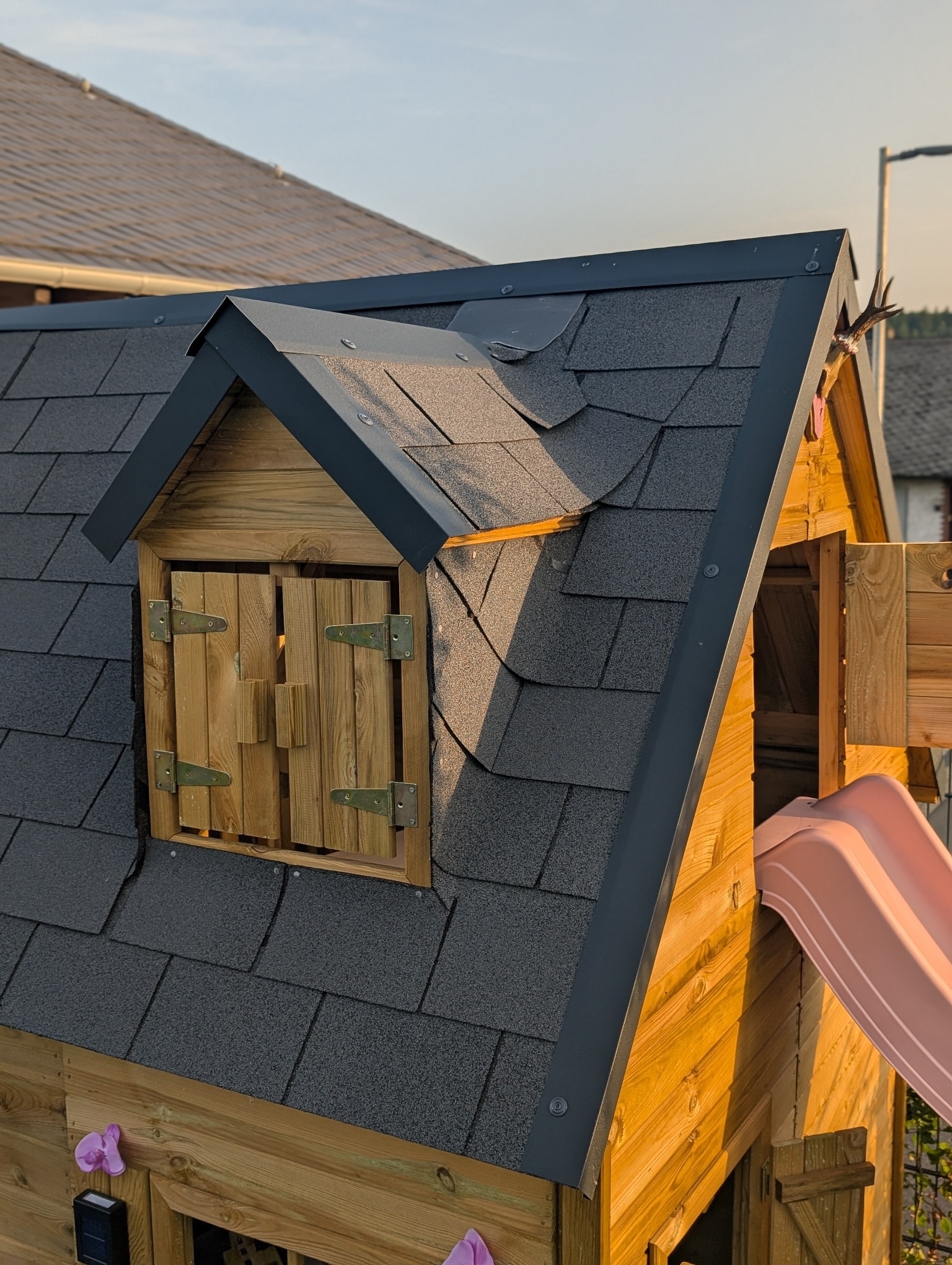 Aus ökologischem Aspekt wird das Spielhaus ohne Dachbelag zur Ersteindeckung geliefert. Wir empfehlen Dachschindeln oder selbstklebende Dachbahn für einen dekorativen und lange haltbaren Dachbelag.