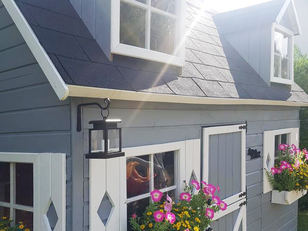 Aus ökologischem Aspekt wird das Spielhaus ohne Dachbelag zur Ersteindeckung geliefert. Wir empfehlen Dachschindeln oder selbstklebende Dachbahn für einen dekorativen und lange haltbaren Dachbelag.