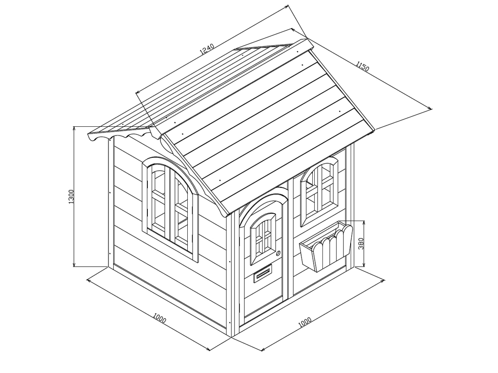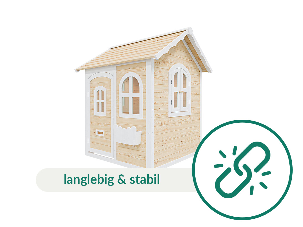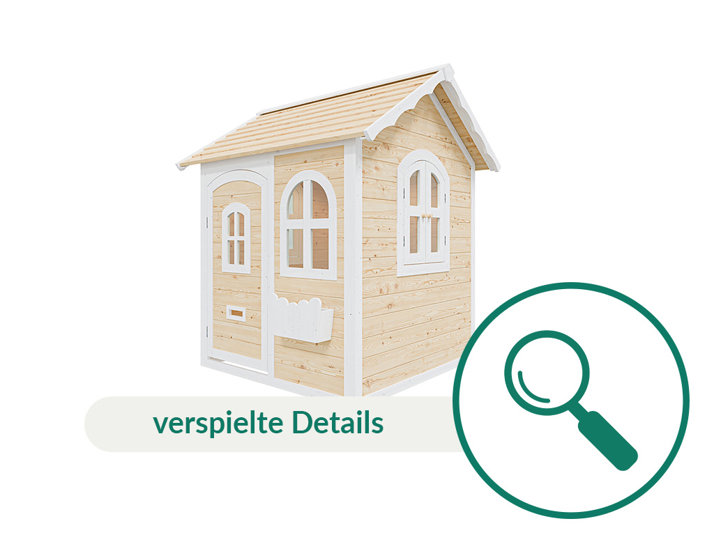 Lieferumfang: Spielhaus Melina, Blumenkasten, Briefkastenschlitz, detaillierte Montageanleitung