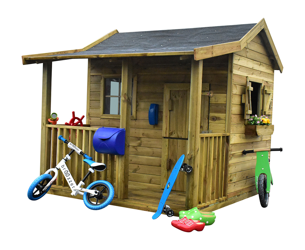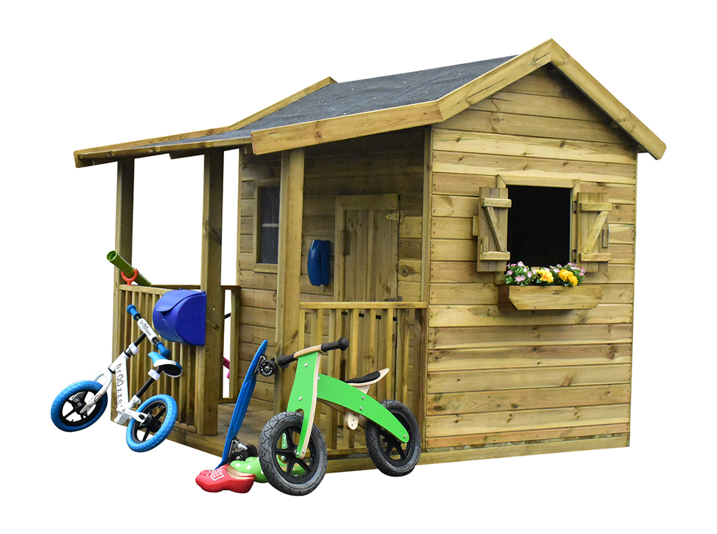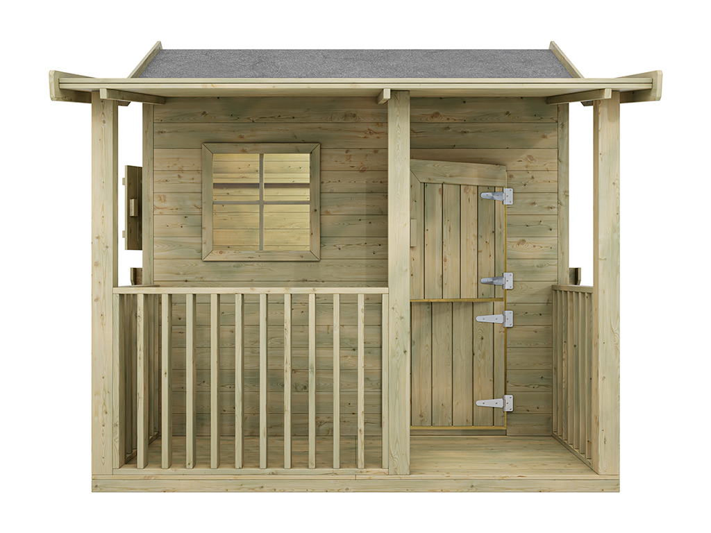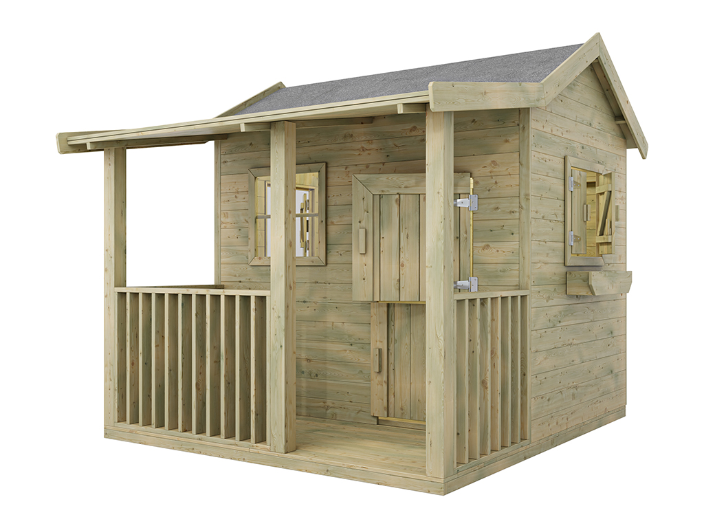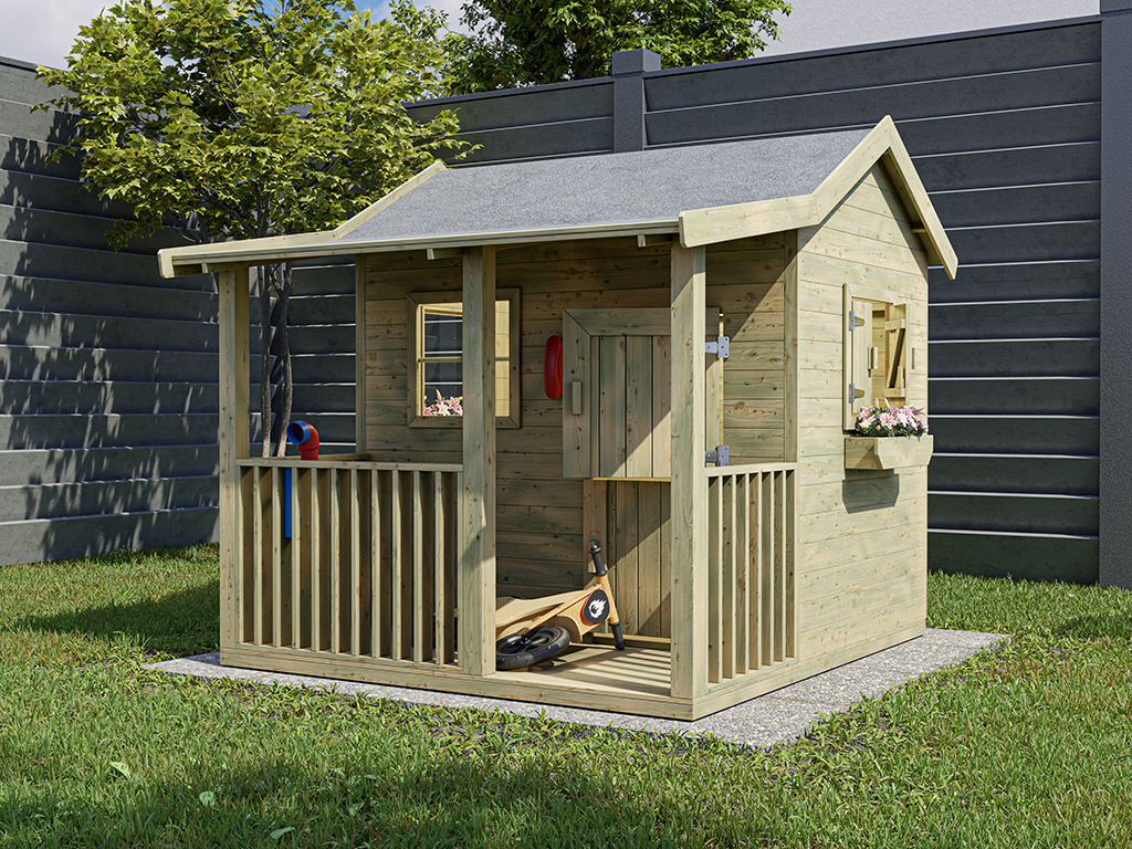 Das Spielhaus wird mit Einzeltür, Veranda, Fußboden, 3 Fenstern und 2 Blumenkästen geliefert und sorgt für großes Spielvergnügen bei den Kindern.