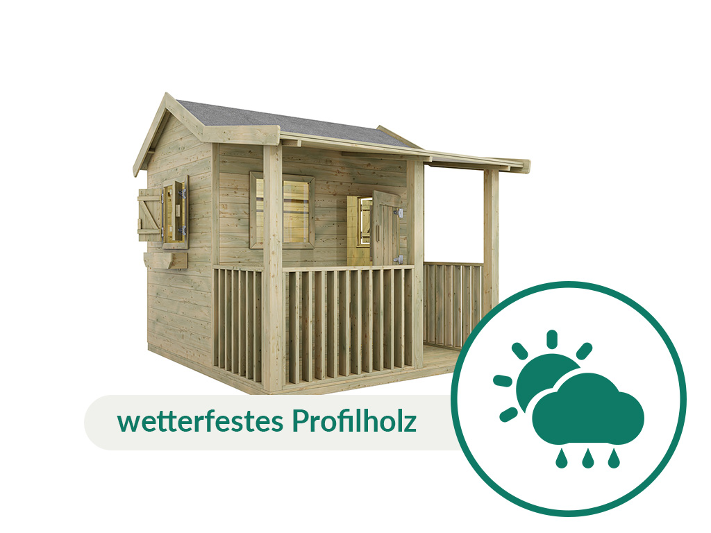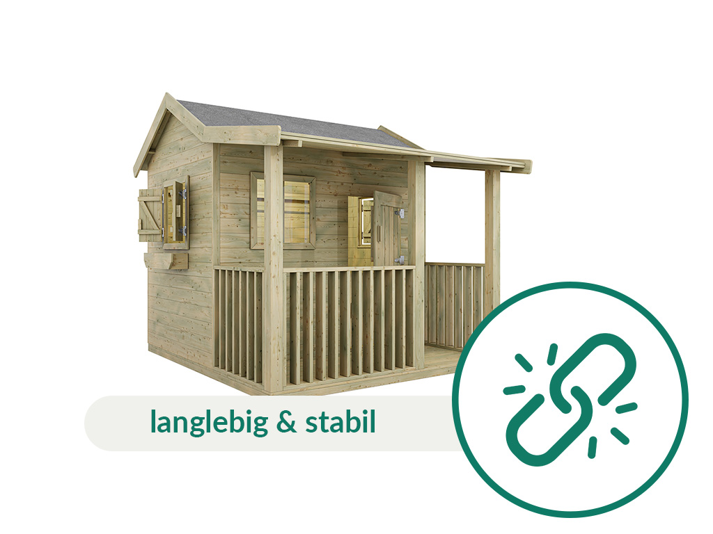 Das Spielhaus ist aus Holz gefertigt. Der Naturstoff ist das perfekte Material für Kinderspielgeräte – strapazierfähig und beständig. Für die Herstellung wurde erstklassiges Kiefernholz verwendet, welches durch seine Widerstandsfähigkeit und Robustheit punktet. Das Holz ist kesseldruckimprägniert, d. h., es werden Imprägniermittel unter hohem Druck ins Holz gepresst. Auf diese Weise dringen sie tief ins Holz ein und schützen es optimal vor UV-Strahlung, Witterung und Schädlingsbefall.Pflegehinweis