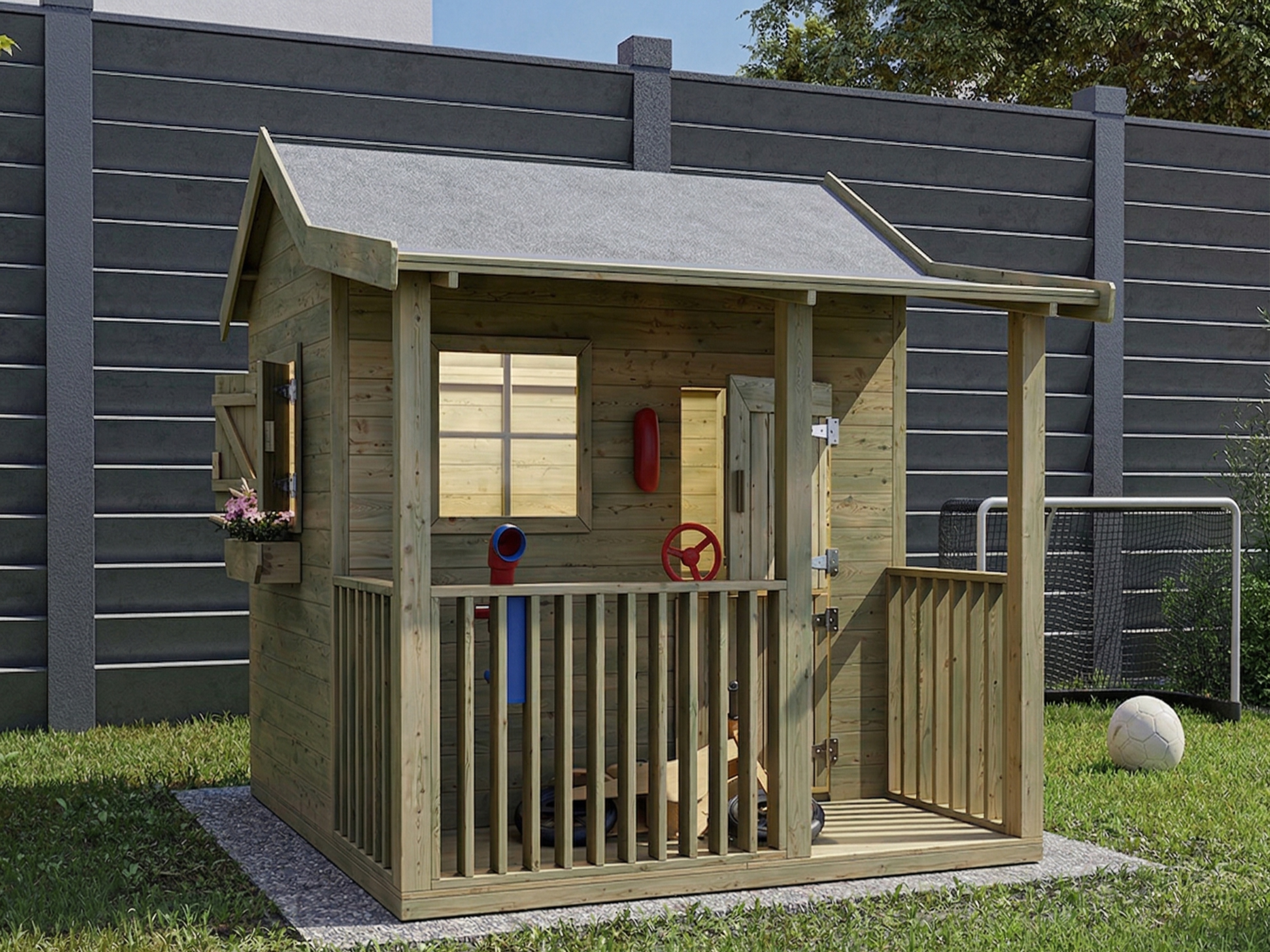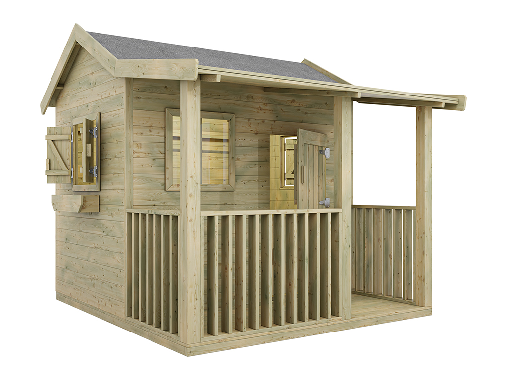 Das Spielhaus wird mit Einzeltür, Veranda, Fußboden, 3 Fenstern und 2 Blumenkästen geliefert und sorgt für großes Spielvergnügen bei den Kindern.