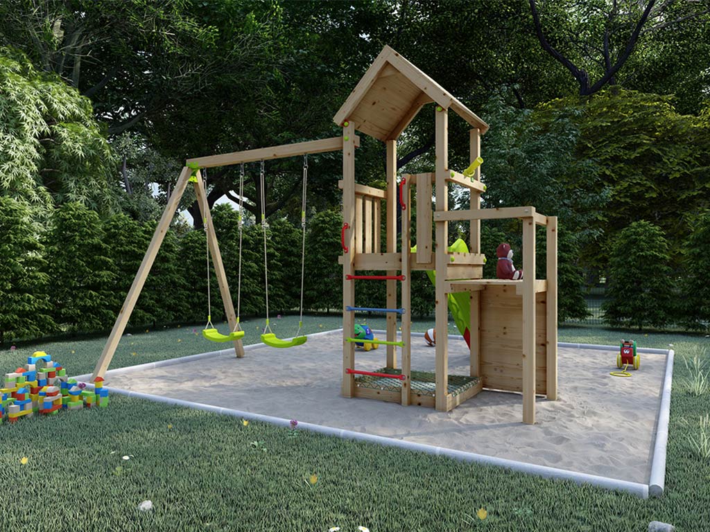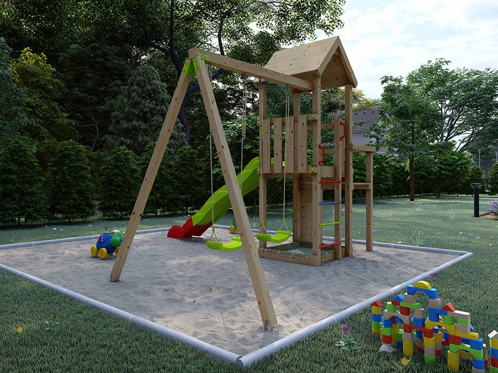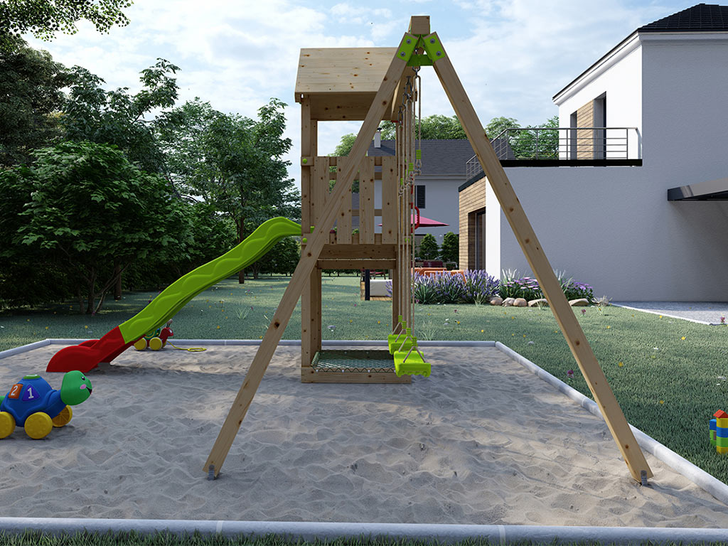 Als ideale Erweiterung für Ihren Spielturm enthält dieser eine Doppelschaukel mit passenden grünen Schaukelsitzen. Für noch mehr Spielspaß für Ihre Kinder. Die Grundkonstruktion des Schaukelanbaus besteht aus einem 9 x 9 cm starken Querbalken und 7 x 7 cm starken Standpfosten. Die Schaukelsitze sind höhenverstellbar. Die Metall-Verbindungsteile werden in grün geliefert.