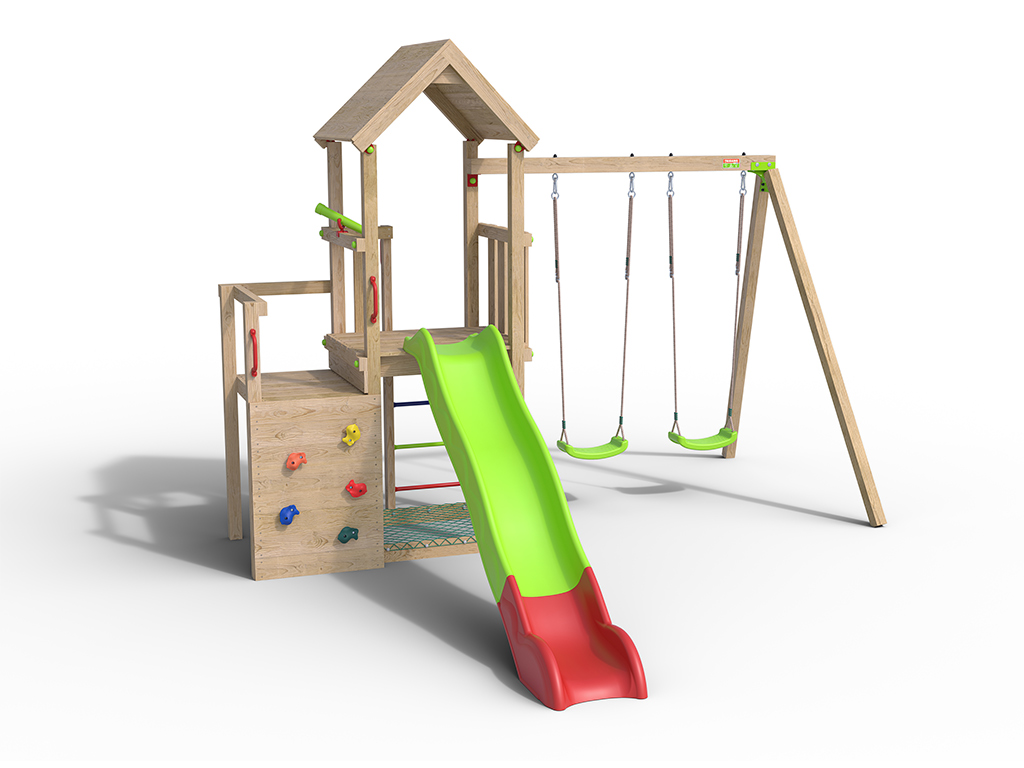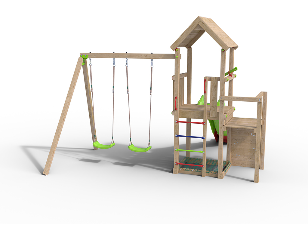Spielturm Amélie inkl. Doppelschaukel + Rutsche grün-rot