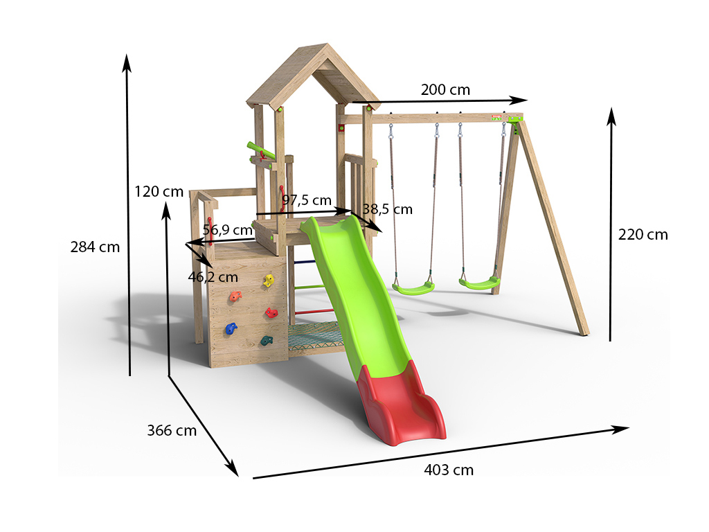 B x T x H: 403 x 366 x 284 cm, inkl. Rutsche + Doppelschaukel, inkl. Kletterwand + Sandkasten + Teleskop uvm.