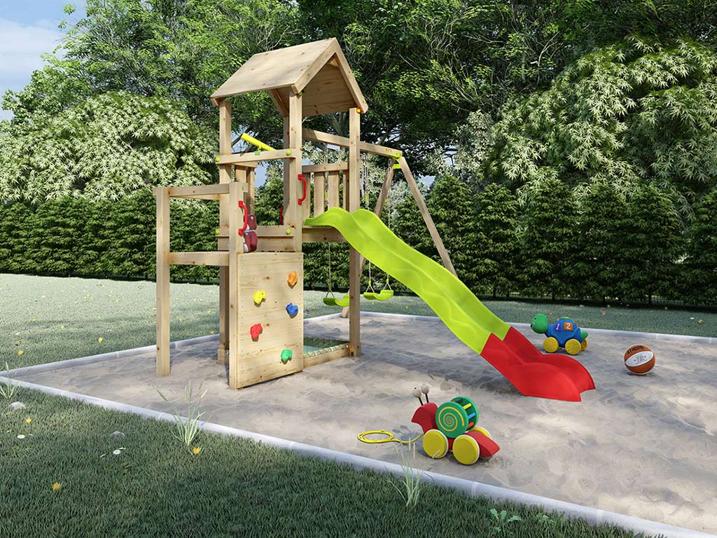Dieser Spielturm bietet einzigartige Erlebnisse. Über die Leiter mit abgerundeten Metallsprossen kommt man mühelos auf das überdachte 120 cm hohe Podest. Außerdem kann das zusätzliche 98 cm hohe Podest von der einen Seite mit einer breiten Kletterwand mit Klettersteinen erklommen werden. - Inkl. überdachter Sandkasten