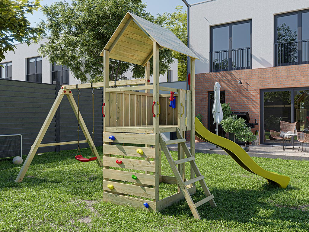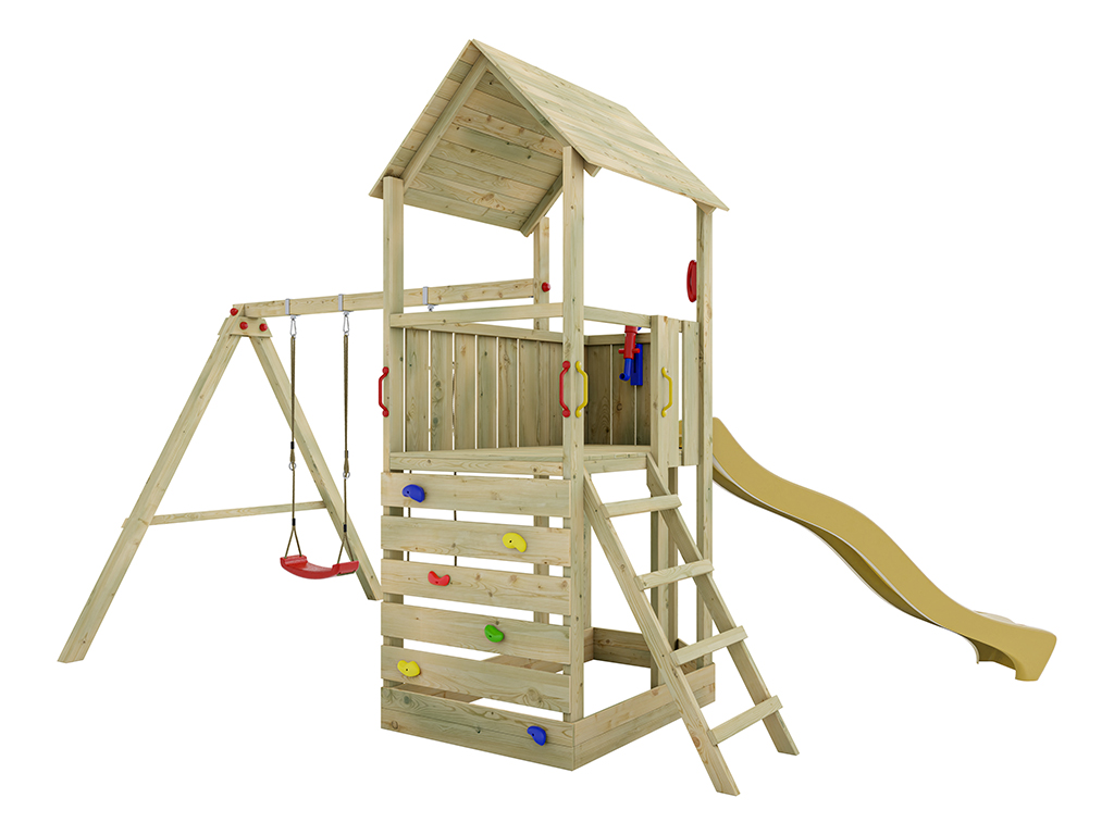 Der Spielturm wird mit Schaukelanbau, Strickleiter, Kletterwand, Leiter, Handgriffen und weiterem Zubehör geliefert und sorgt für großes Spielvergnügen bei den Kindern.