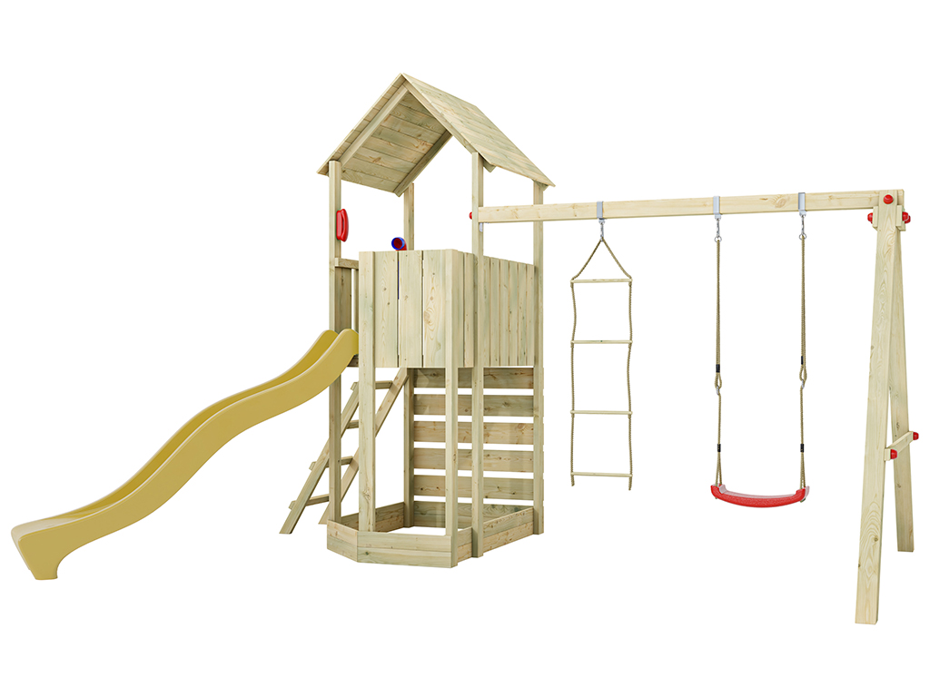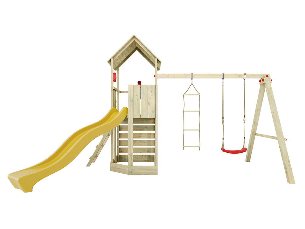 Der Spielturm ist aus kesseldruckimprägniertem Kiefern-Profilholz gearbeitet und ist somit besonders witterungsbeständig. Die 4 x 9 cm und 3 x 9 cm starken Spielturmpfosten verleihen dem Spielturm höchste Stabilität. - Inklusive Schaukelsitz und Strickleiter