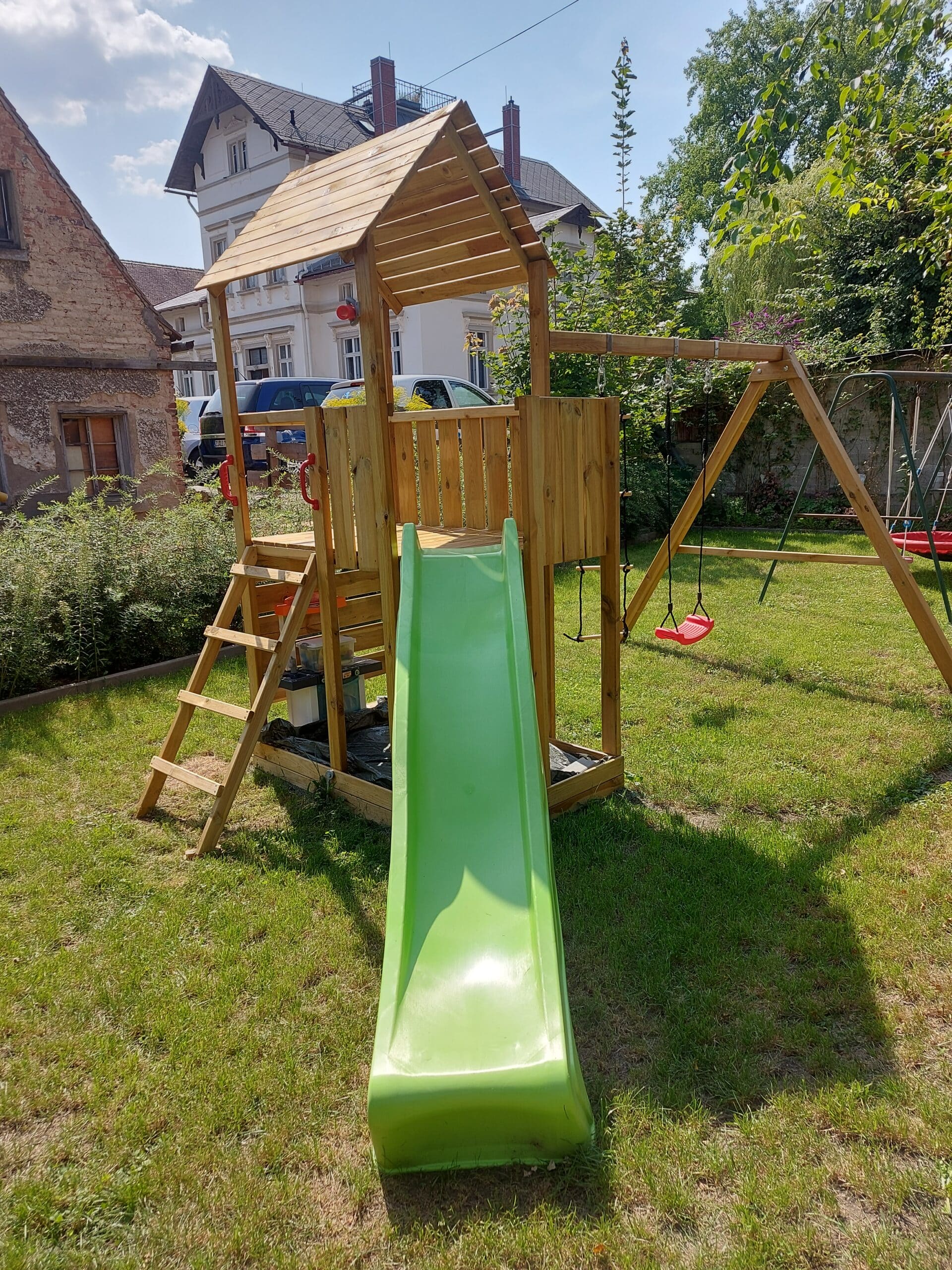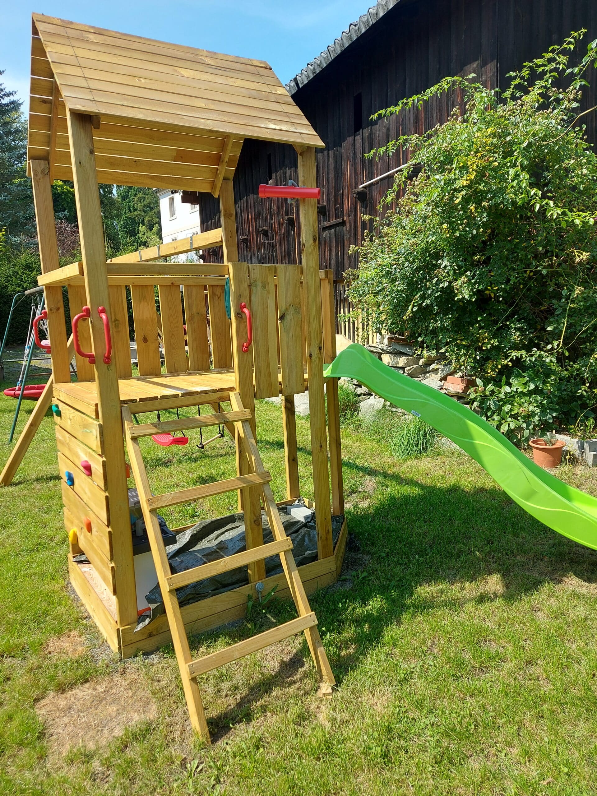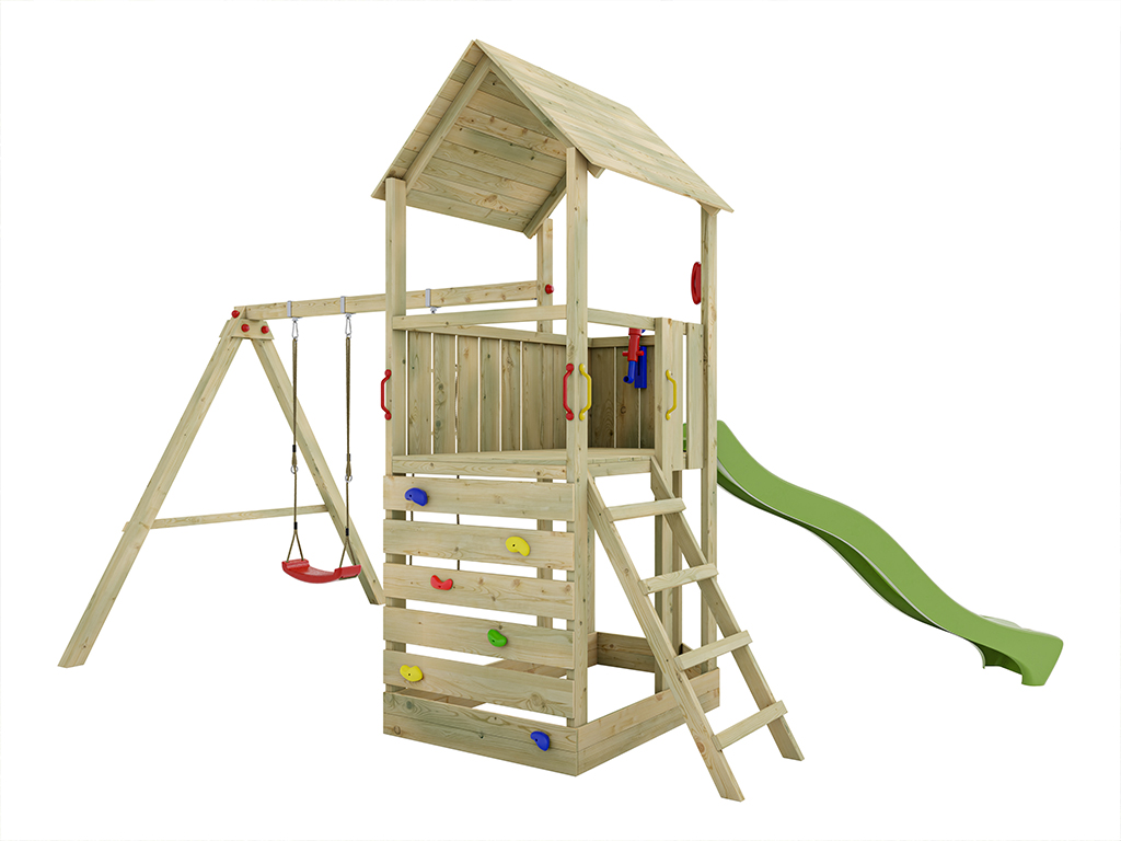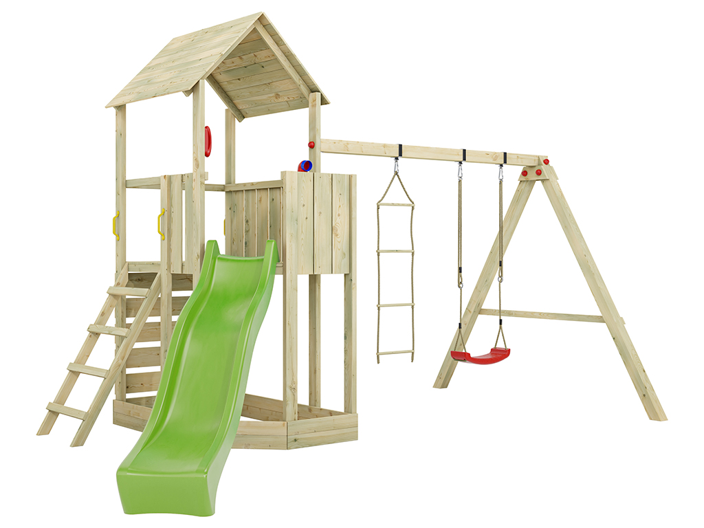 Der Spielturm wird mit Schaukelanbau, Strickleiter, Kletterwand, Leiter, Handgriffen und weiterem Zubehör geliefert und sorgt für großes Spielvergnügen bei den Kindern.