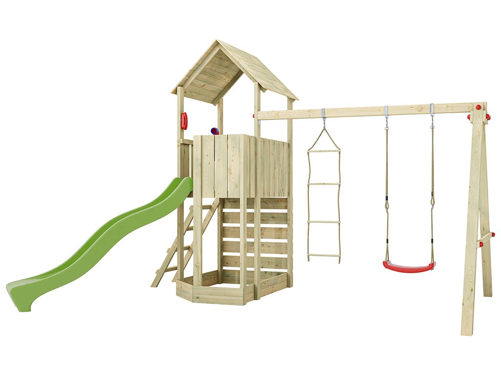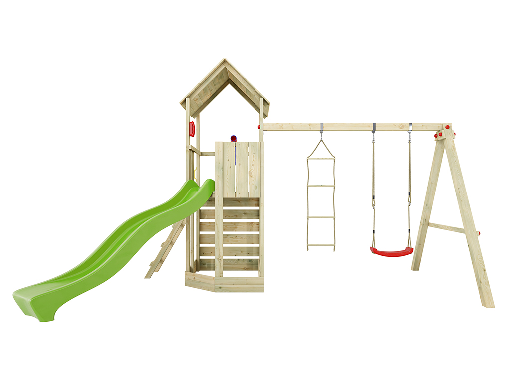 Der Spielturm ist aus kesseldruckimprägniertem Kiefern-Profilholz gearbeitet und ist somit besonders witterungsbeständig. Die 4 x 9 cm und 3 x 9 cm starken Spielturmpfosten verleihen dem Spielturm höchste Stabilität. - Inklusive Schaukelsitz und Strickleiter