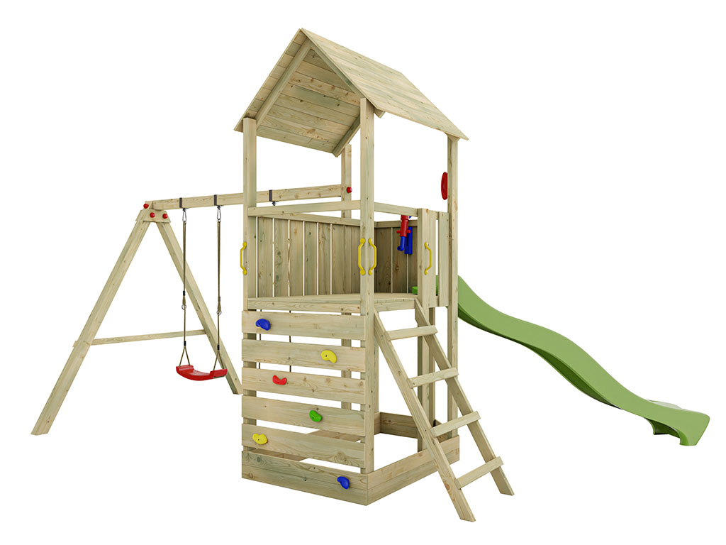 Dieser Spielturm ist aus Holz gefertigt. Der Naturstoff ist das perfekte Material für Kinderspielgeräte – strapazierfähig und beständig. Für die Herstellung wurde erstklassiges Kiefernholz verwendet, welches durch seine Widerstandsfähigkeit und Robustheit punktet. Das Holz ist kesseldruckimprägniert, d. h., es werden Imprägniermittel unter hohem Druck ins Holz gepresst. Auf diese Weise dringen sie tief ins Holz ein und schützen es optimal vor UV-Strahlung, Witterung und Schädlingsbefall. Bei KDI-Holz ist keine Nachbehandlung notwendig.Pflegehinweis