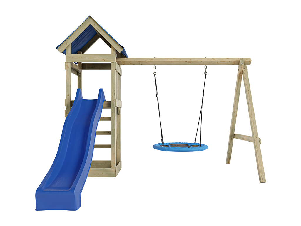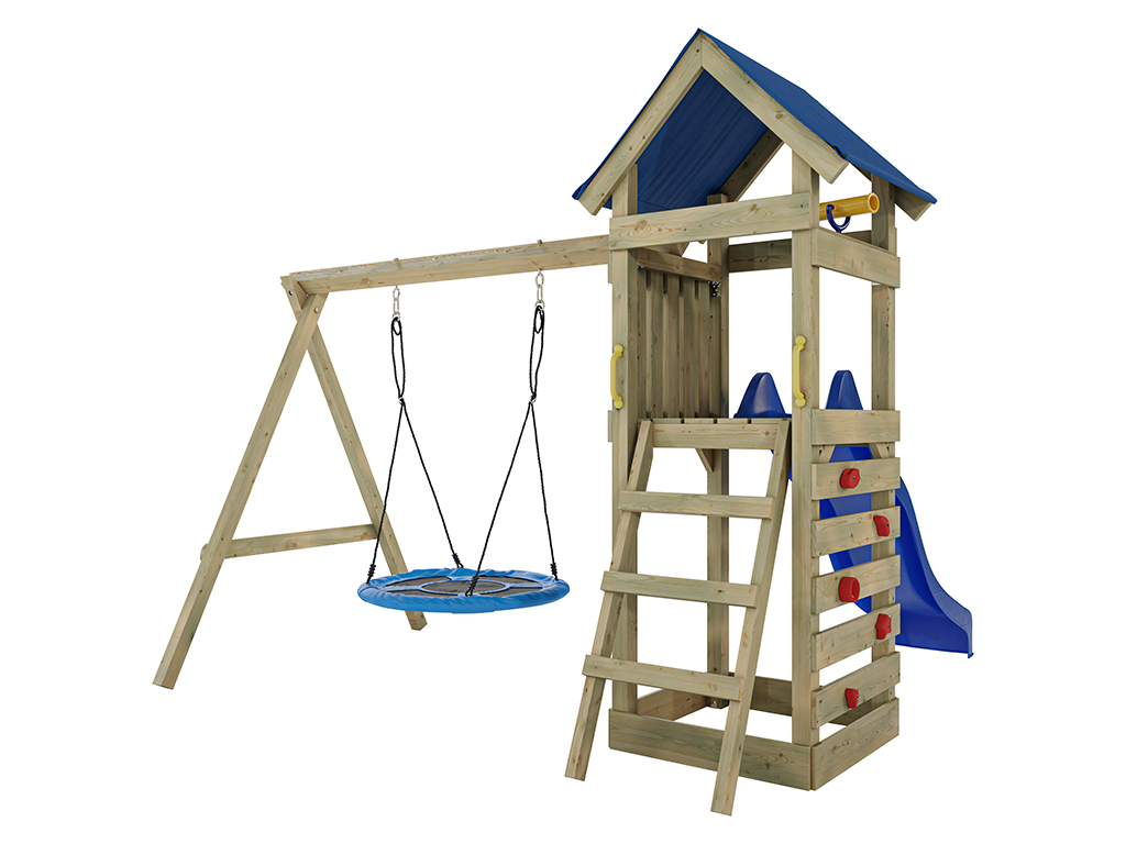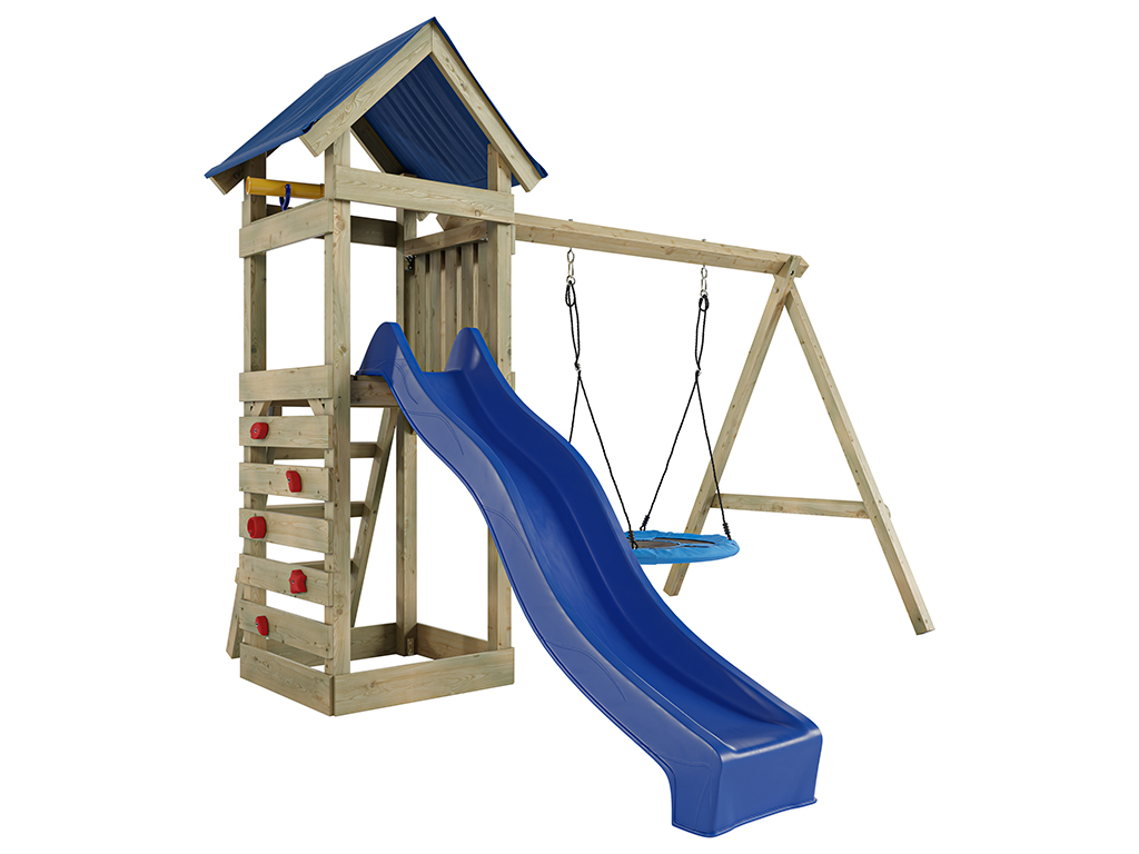 Material: Holz, B x T x H: 327 x 317 x 258 cm, inkl. Kletterwand, inkl. Rutsche blau + Nestschaukel