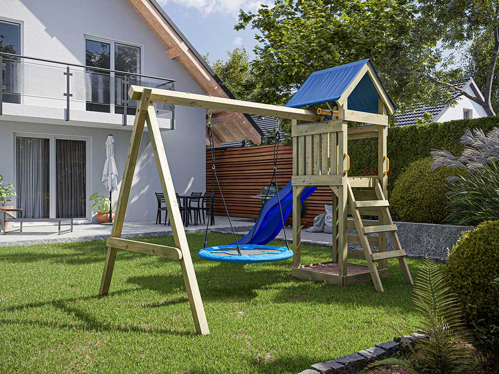 Spielturm Easy KDI inkl. Doppelschaukel inkl. Rutsche blau + Nestschaukel