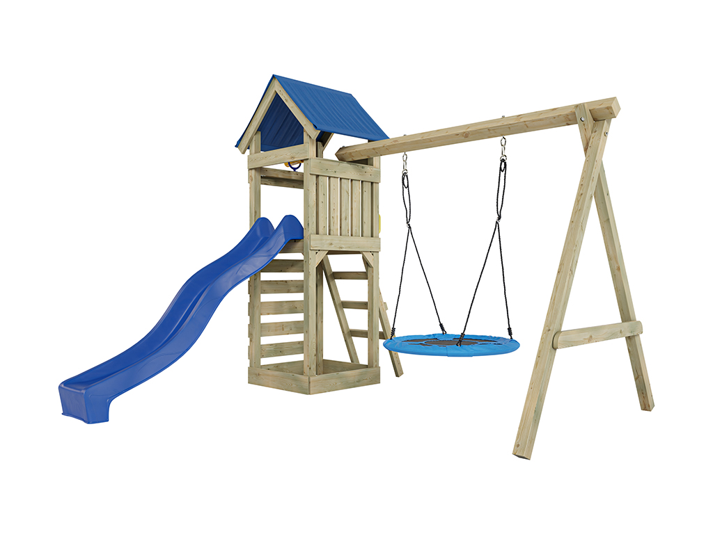 Material: Holz, B x T x H: 327 x 317 x 258 cm, inkl. Kletterwand, inkl. Rutsche blau + Nestschaukel