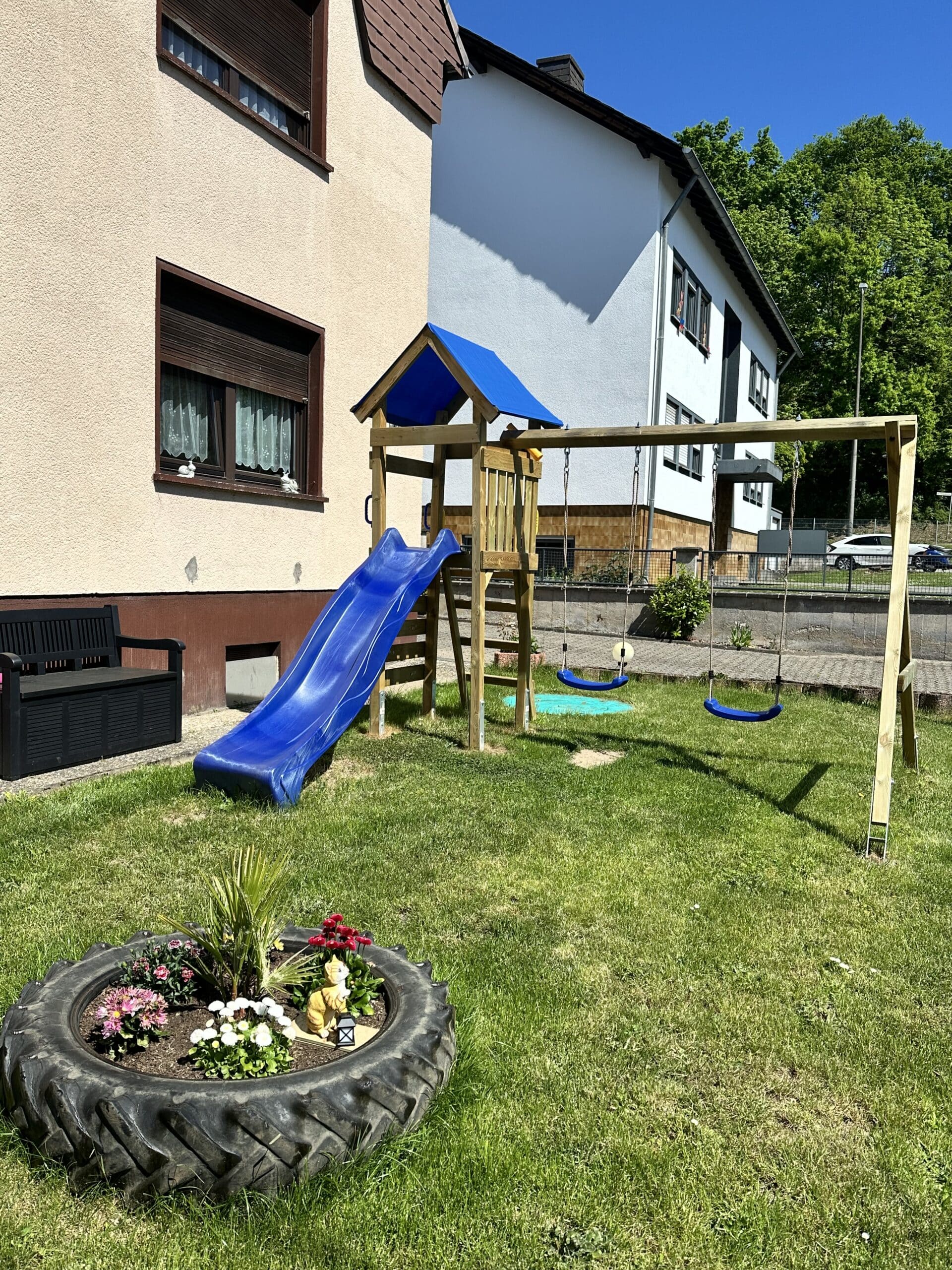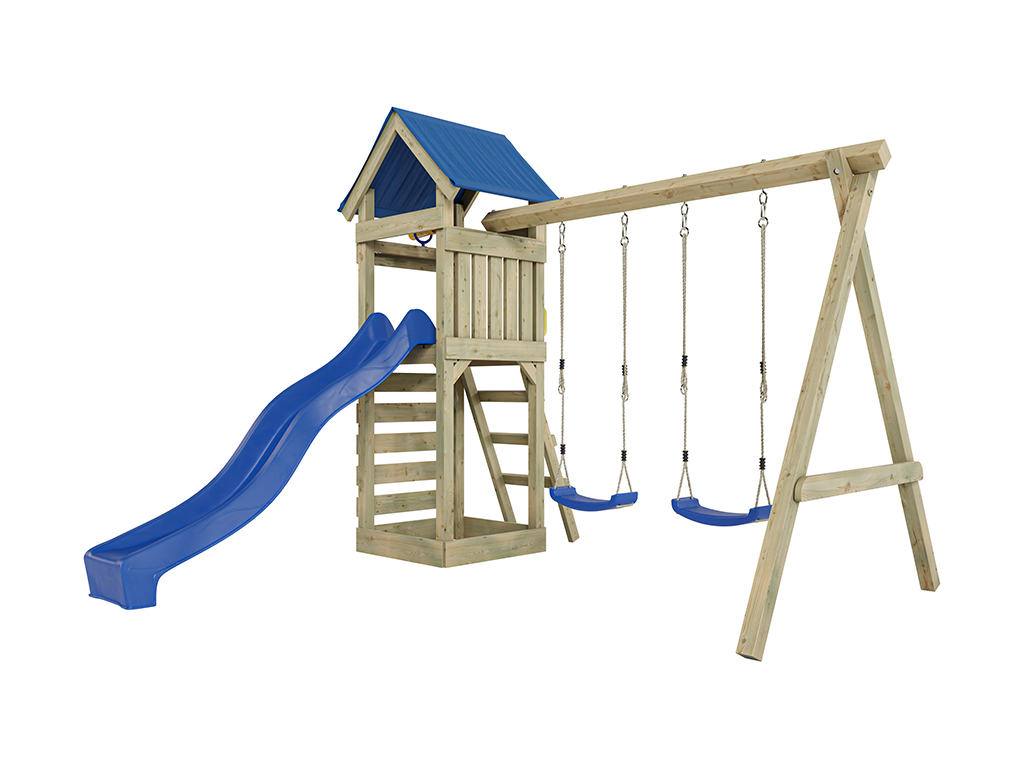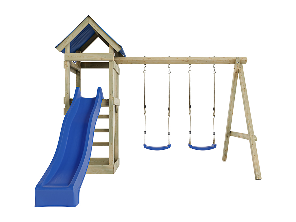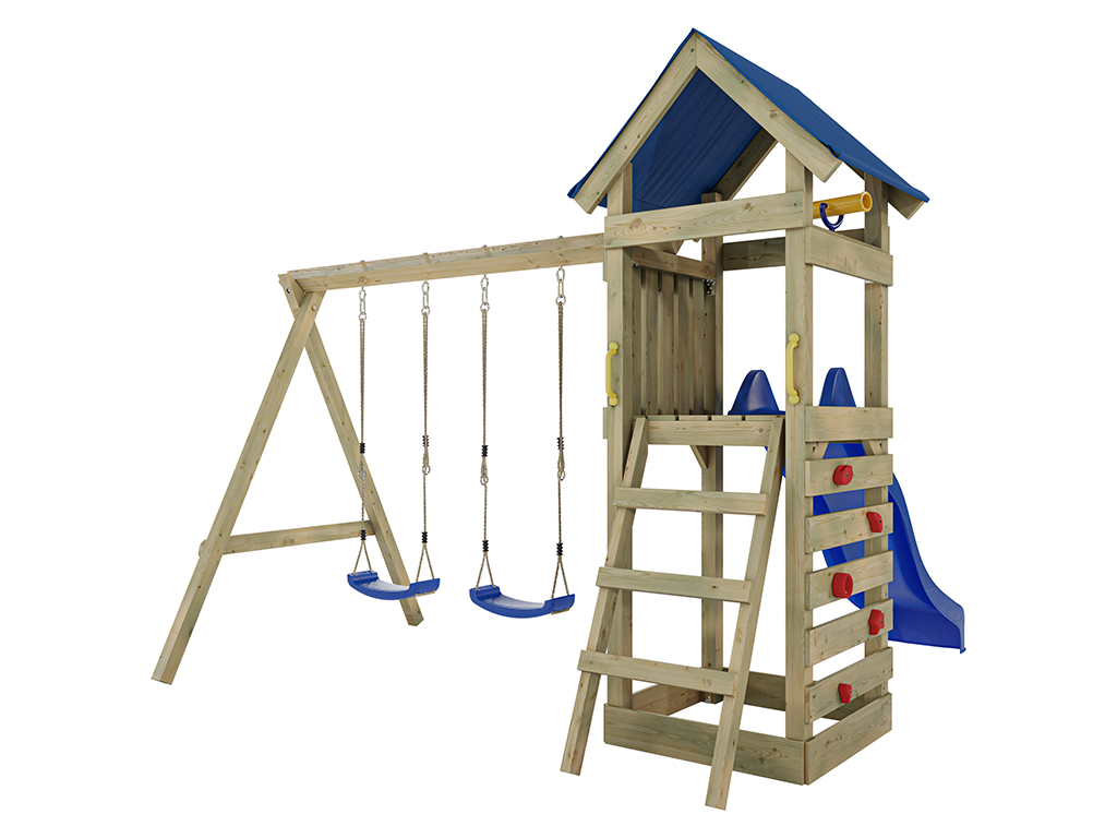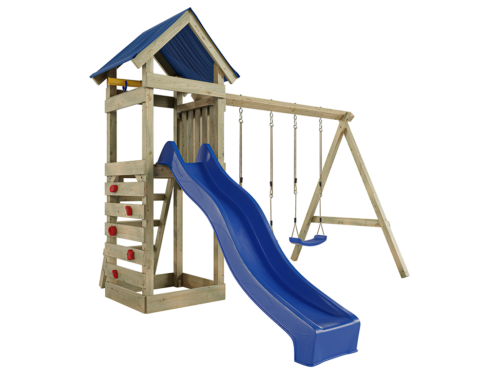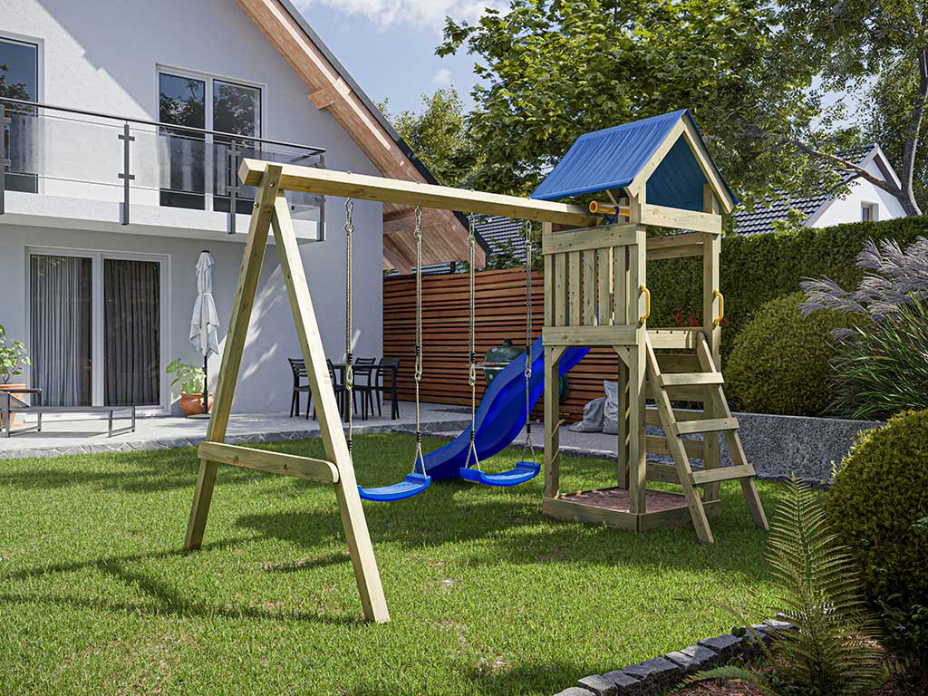 - Inklusive einer Doppelschaukel in Blau mit 9 x 9 cm starkem Schaukelbalken.