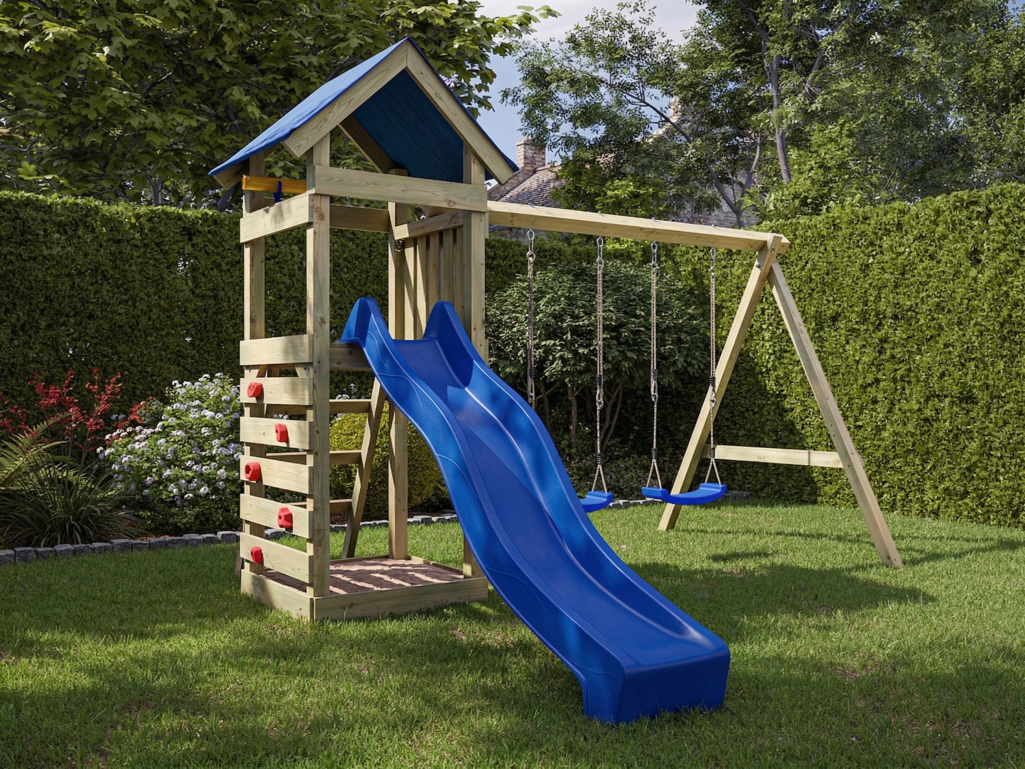 - Inklusive einer Doppelschaukel in Blau mit 9 x 9 cm starkem Schaukelbalken.
