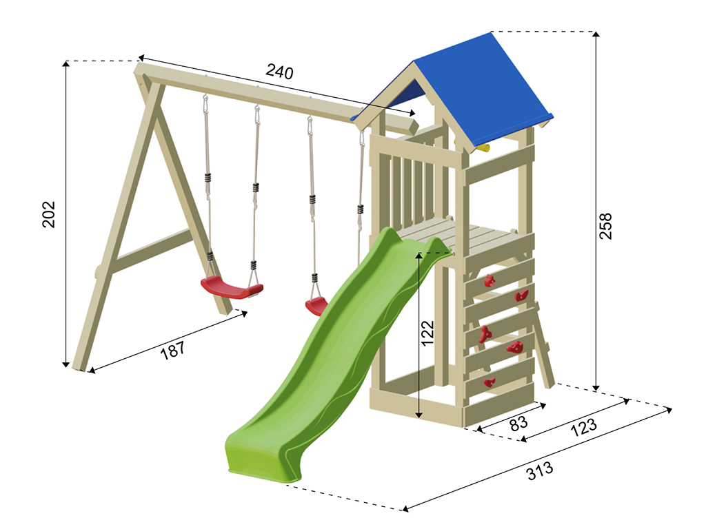 Dieser Spielturm bietet deinem Kind einzigartige Erlebnisse mit viel Bewegung und Abenteuer – ein wahrer Spieltraum! Das Außenmaß dieses Spielturms beträgt 327 x 317 cm. Die Firsthöhe liegt bei 258 cm.