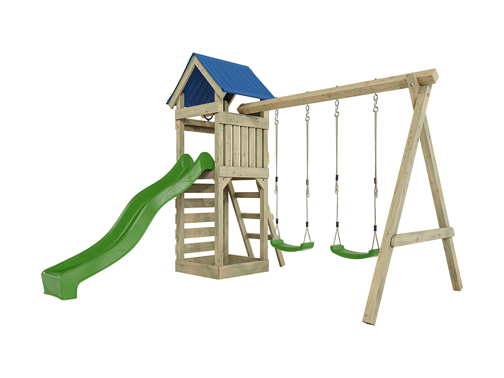 - Inklusive einer Doppelschaukel in Grün mit 9 x 9 cm starkem Schaukelbalken.