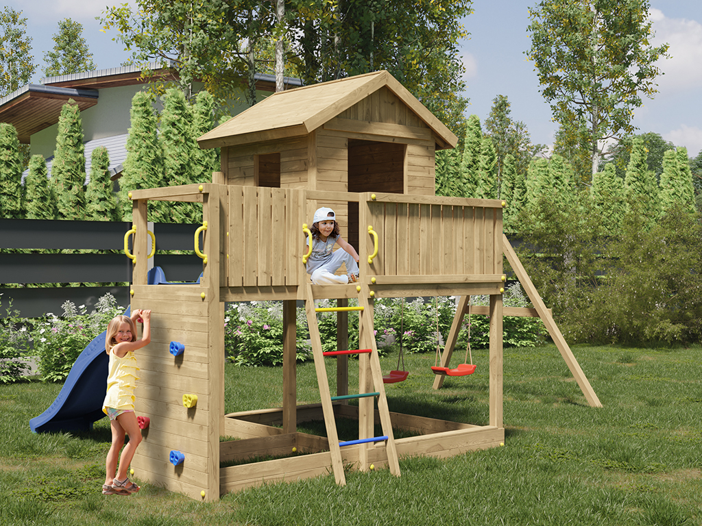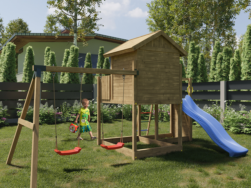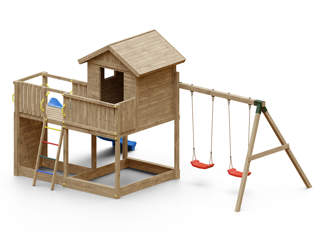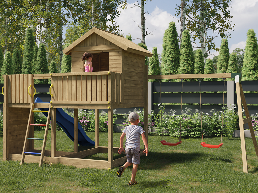 Die Grundkonstruktion des Spielturms ist besonders witterungsbeständig. Die massiven 7 x 7 cm starken Pfosten aus robustem Nadelholz wurden kesseldruckimprägniert. Das Spielhaus ist durch das spezielle Holzschutzverfahren der Kesseldruckimprägnierung, bei dem eine Salz-Wasserlösung (chromfrei sowie umweltfreundlich und unbedenklich) porentief in das Holz gepresst wird, vor Fäulnis und holzzerstörenden Pilzen für viele Jahre geschützt. Das Spielhaus benötigt daher keinen weiteren Schutzanstrich. Das Imprägniersalz schützt die Holzzellen und das Wasser kann danach wieder entweichen. Je nach Witterungsbedingungen kann dieser Trocknungsprozess langsam oder schnell gehen. Um das natürliche Vergrauen durch die Witterung kannst du dein Spielhaus gerne - aber erst nach vollständiger Trocknung - individuell farbig gestalten. Wir empfehlen dazu eine deckende, offenporige Holzschutzlasur. Weitere Informationen zur Kesseldruckimprägnierung findest du im "Infoblatt Kesseldruckimprägnierung" in unserem Downloadbereich. - Inkl. Doppelschaukel