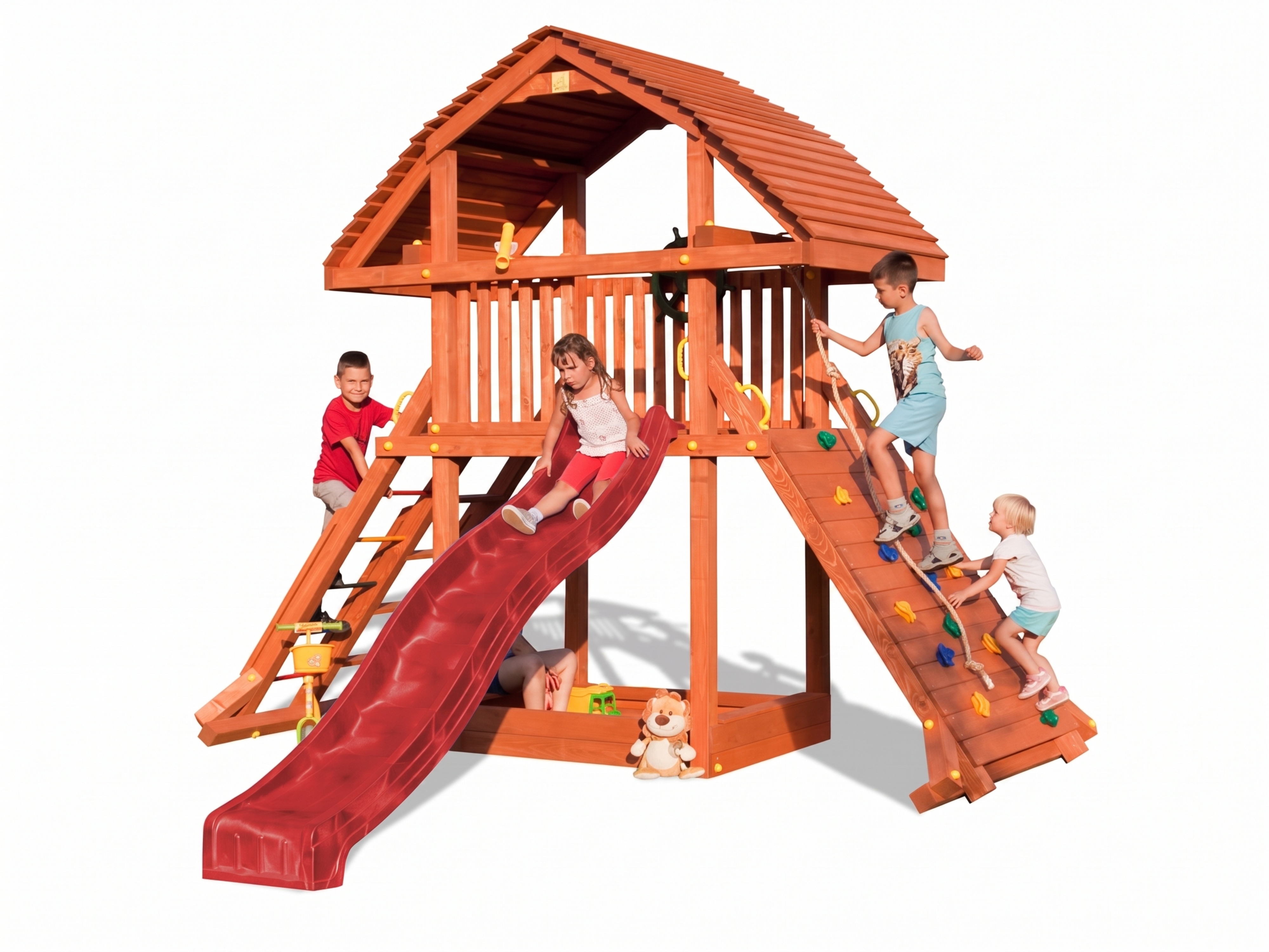 Material: Holz, B x T x H: 373 x 385 x 313 cm, inkl. Rutsche rot, inkl. Kletterrampe + 2-teiliger Leiter uvm.