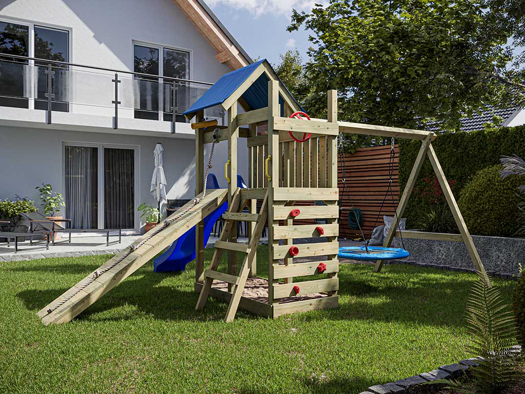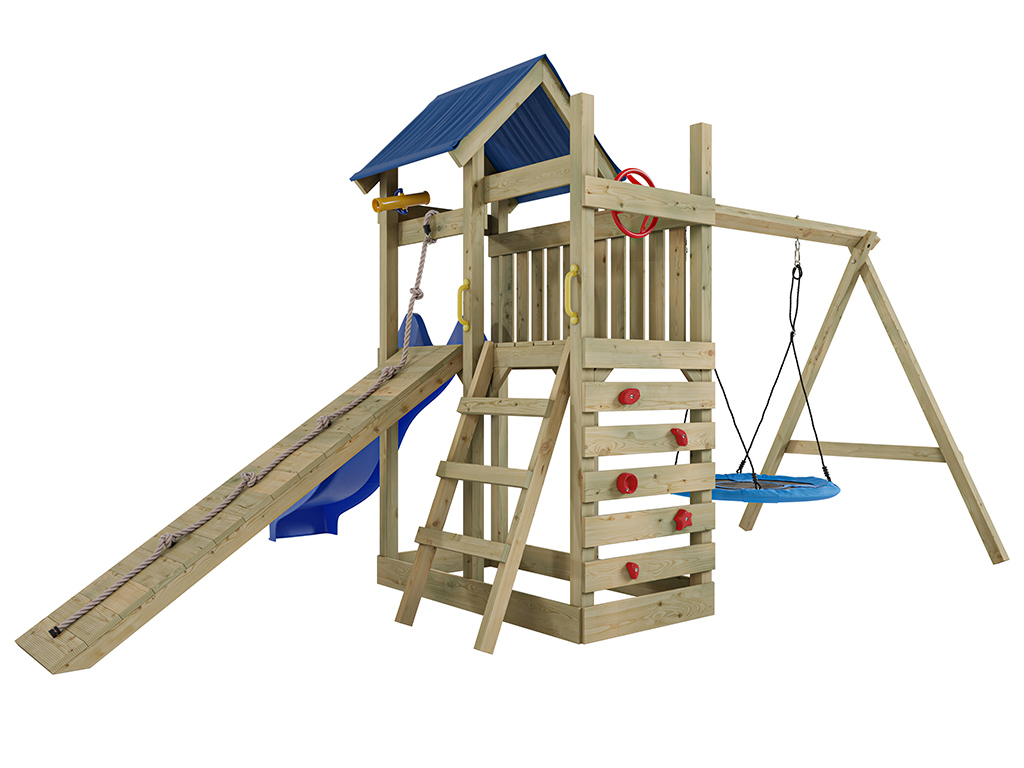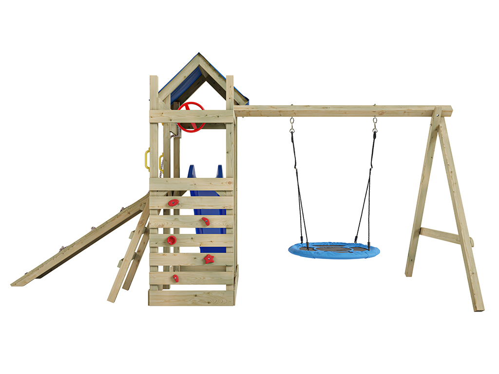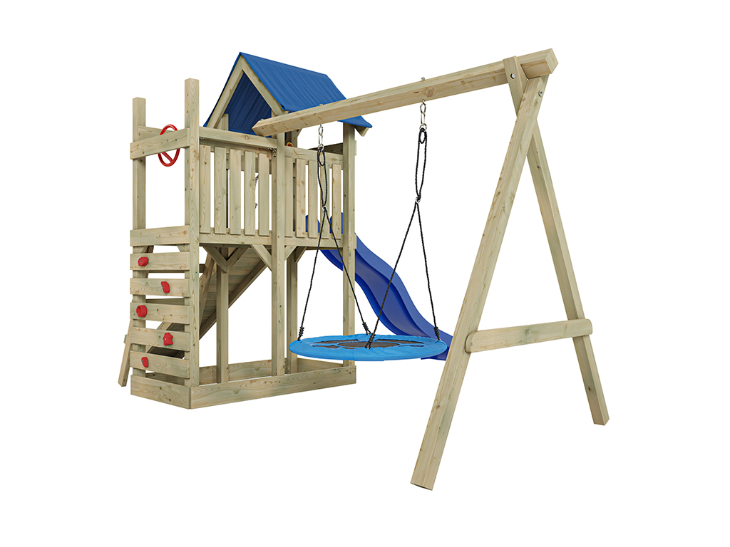 Material: Holz, B x T x H: 481 x 486 x 258 cm, inkl. Kletterwand, inkl. Rutsche blau + Nestschaukel